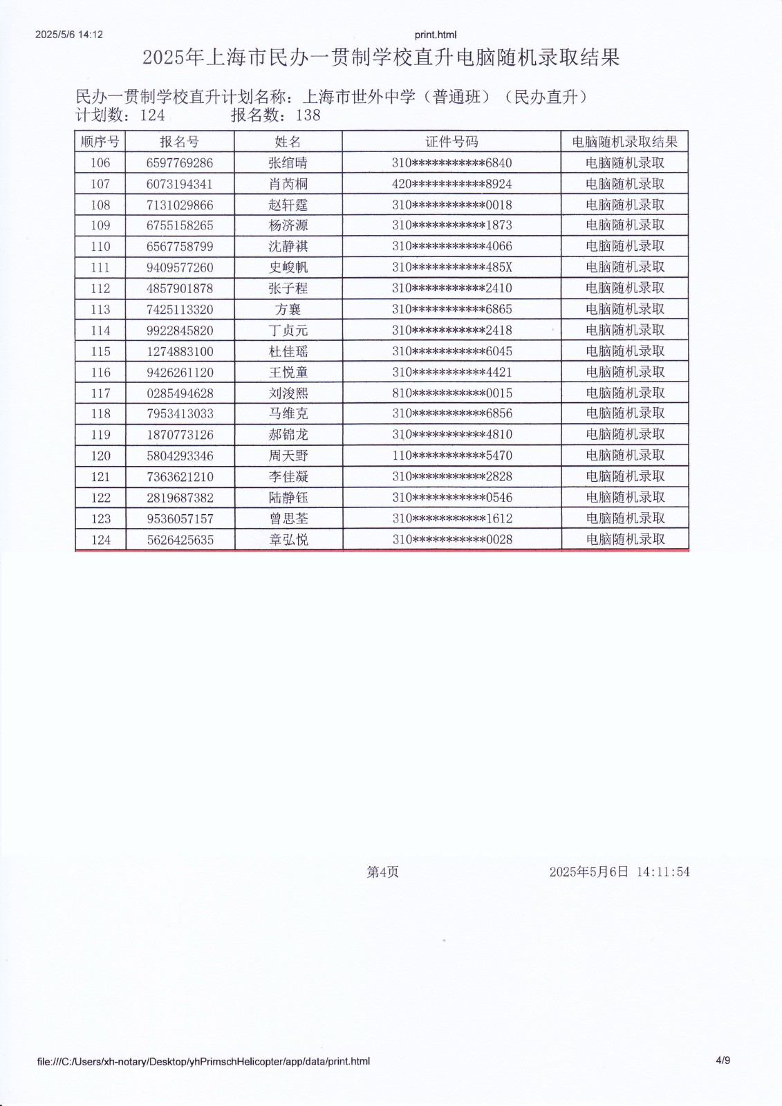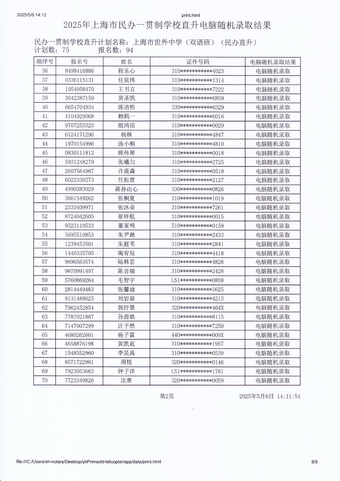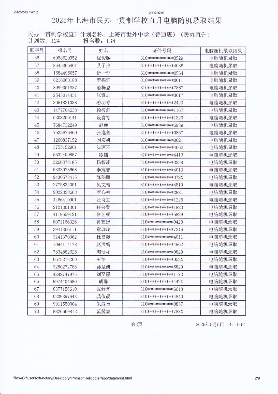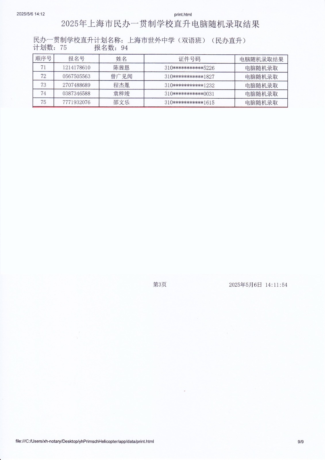 2025年上海市民办一贯制学校直升电脑随机录取结果