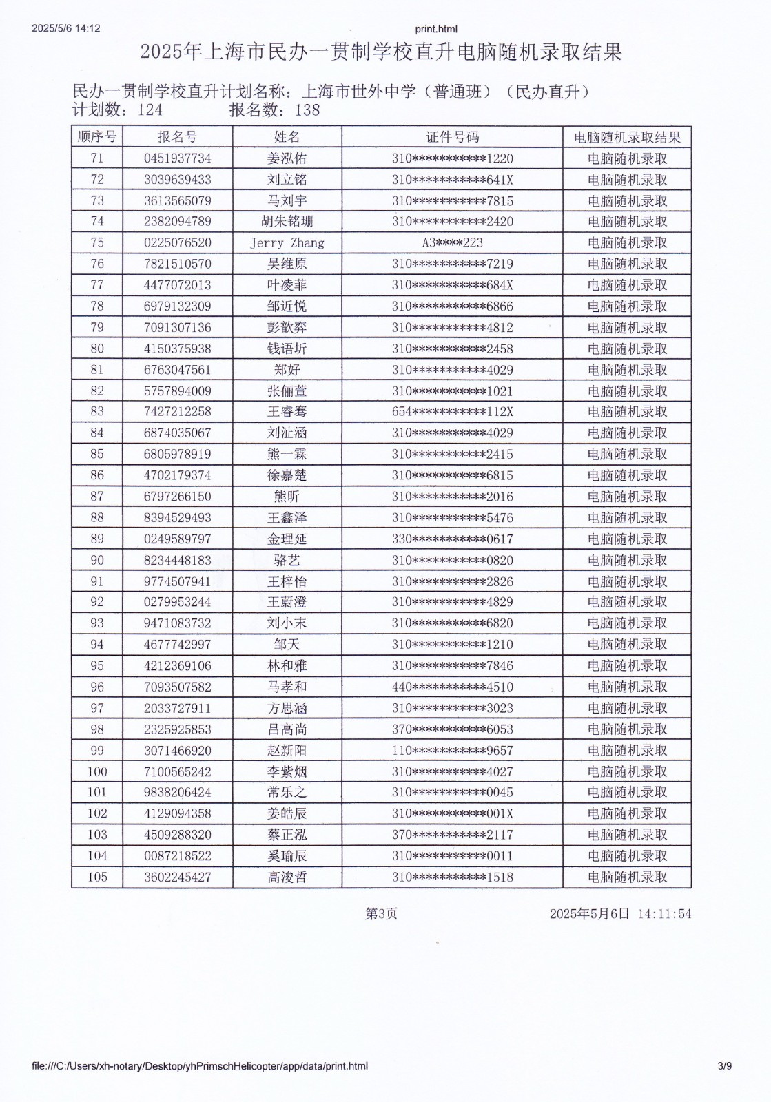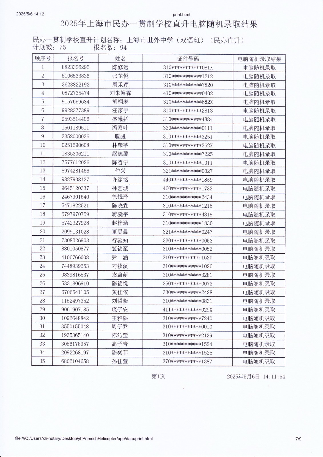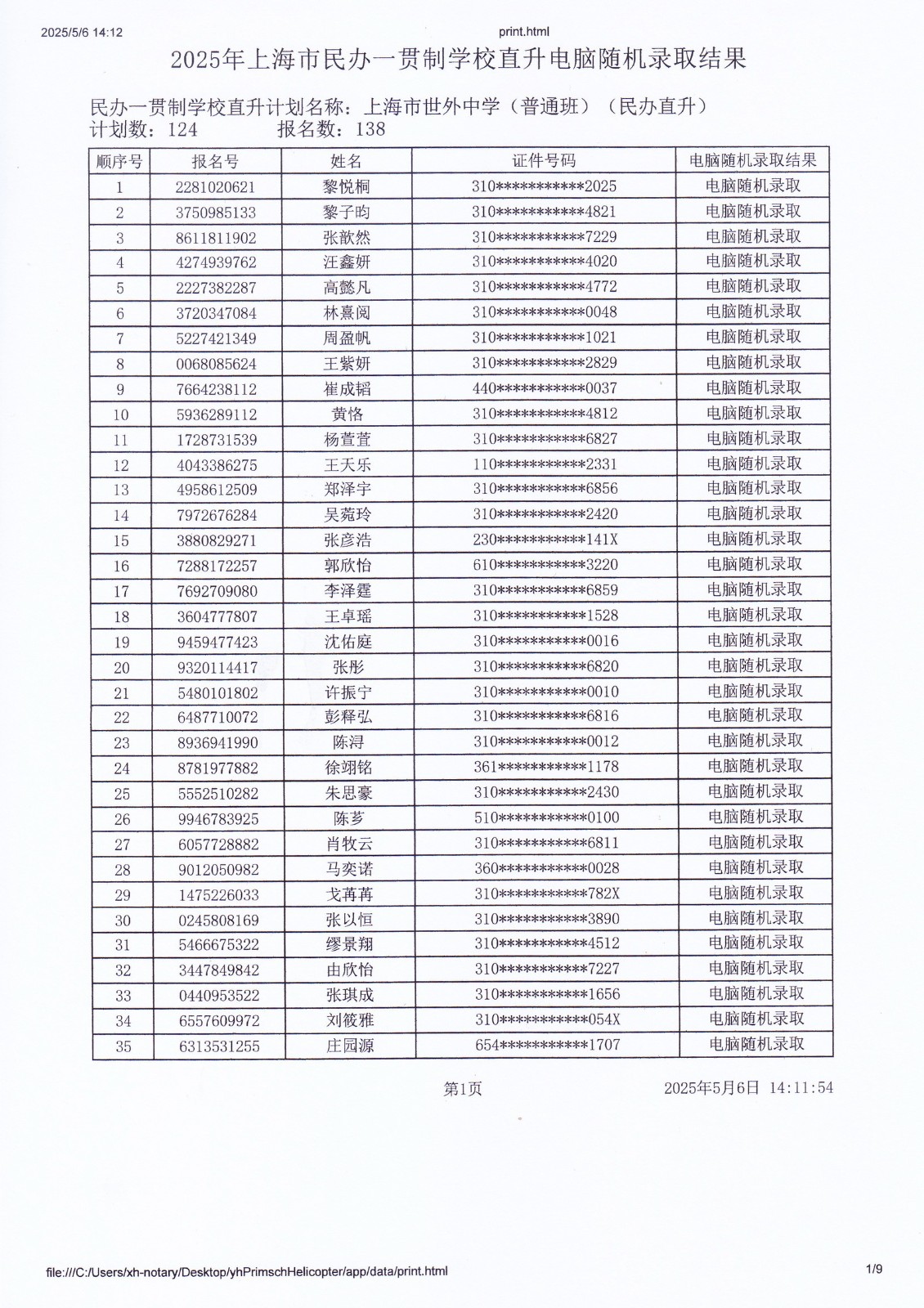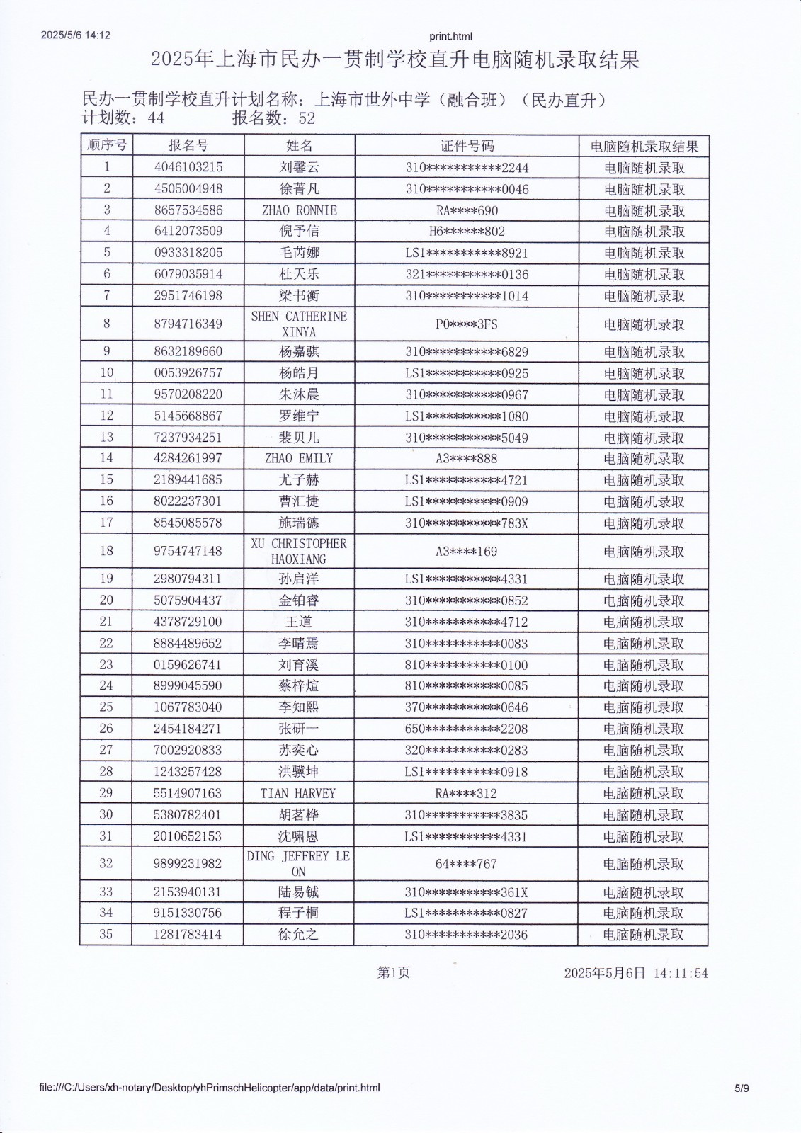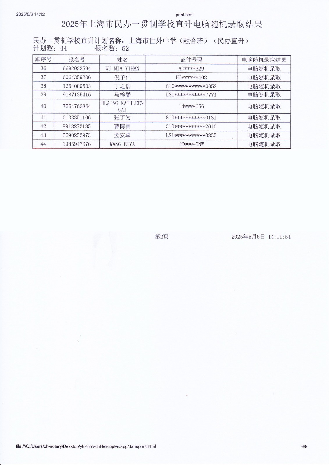 2025年上海市民办一贯制学校直升电脑随机录取结果