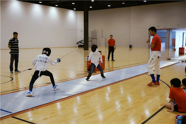 游戏环节之后进行了击剑比赛。击剑是从古代剑术决斗中发展起来的一项体育项目,它结合优雅的动作和灵活的战术,要求运动员精神的高度集中和身体的良好协调性,体现出运动员良好的动作和敏捷的反应。运动员穿戴击剑服装和护具,在击剑场上以一手持剑互相刺击,被先击中身体有效部位的一方,为被击中一剑。