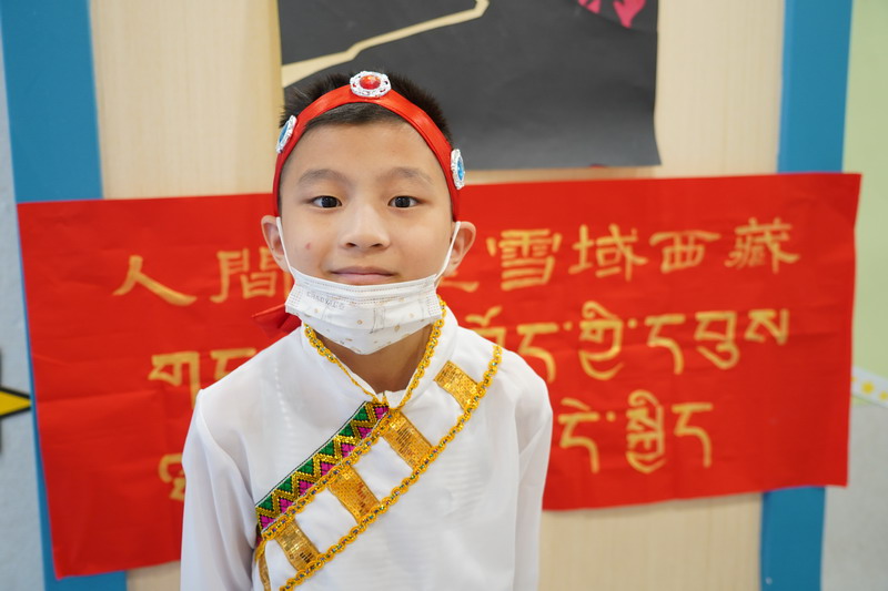 西藏小组通过资料搜寻和小报制作,了解了西藏是离太阳最近的地方,有蓝天、碧湖,白雪、绿草、牧民的牛毛帐篷及五彩的经幡,孕育了勤劳善良的藏民族,也造就了独特的民族风情。西藏研究小组的同学身着美丽的藏族服装,载歌载舞。