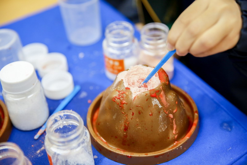 哇!那里有好几个小朋友在敲着非洲鼓点!听着有节奏感的旋律,看到了“恩戈罗火山模型”,我们来到了2D班的展区:恩戈罗火山、奥卡万戈三角洲、撒哈拉大沙漠和纳特龙湖,还能了解到非洲动物大迁徙的全过程。