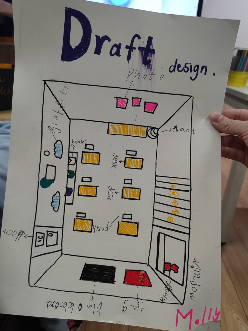 首先,他们需要从教室、科学室、操场和艺术室中任选其一,为自己的梦想教室设计一张blueprint!
