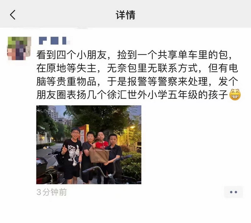 在这次国庆假期,百瑞彩票双语部五年级的4名同学,分别是:王卓尔、贾宸熙、黄修平、贾宸霖,他们在路过嘉定的一处共享单车的停放处时,无意在—辆单车的车筐中意外发现了一只手提包,这几个热心的孩子们马上当起了“小卫士”。