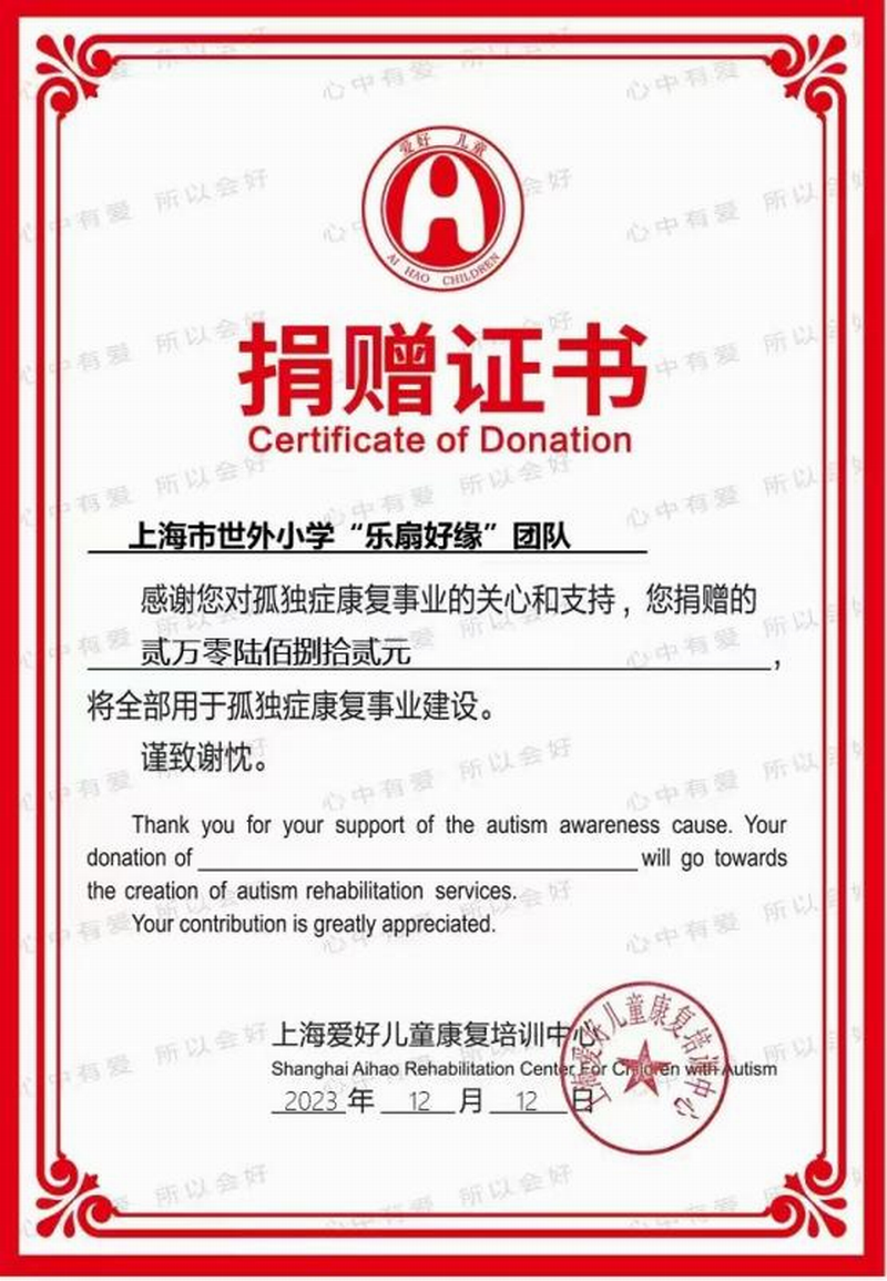 通过此次活动,同学们认为一个优秀的企业家不仅是一个成功的商人,他在创造财富的同时,更应肩负社会责任,帮助有需要的群体,回馈社会。12月12日,团队的同学们走进上海爱好儿童康复培训中心。他们走近星星的世界,聆听培训中心老师的介绍,并与大龄班的孩子亲密互动。团队捐赠了全部利润,用于自闭症儿童的康复训练。