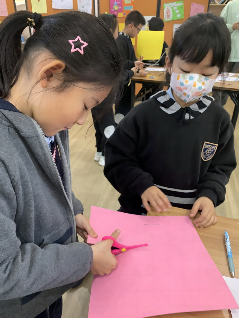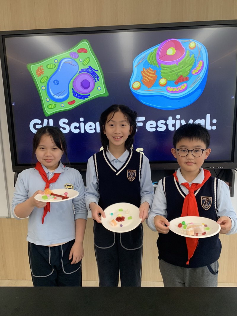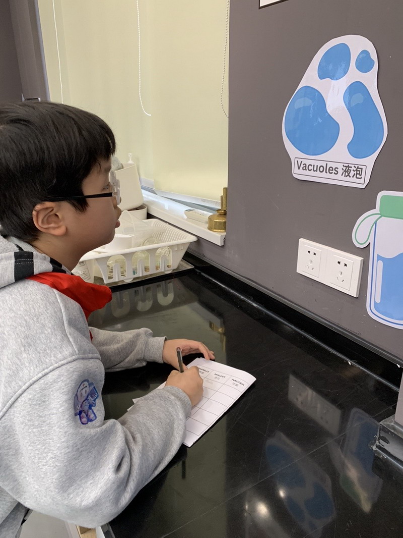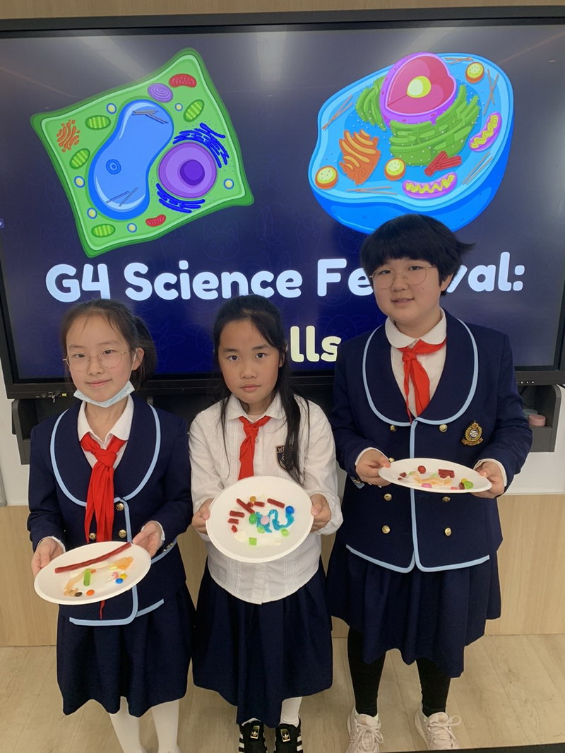 四年级的同学们正在学习“细胞”单元。在科技节中,我们的教室化身为“巨型细胞”,同学们在教室中找到细胞中各种细胞器对应的物品,完成了一本细胞的介绍书籍。在接下来的一周里,同学们用各种不同的糖果制作了细胞模型。