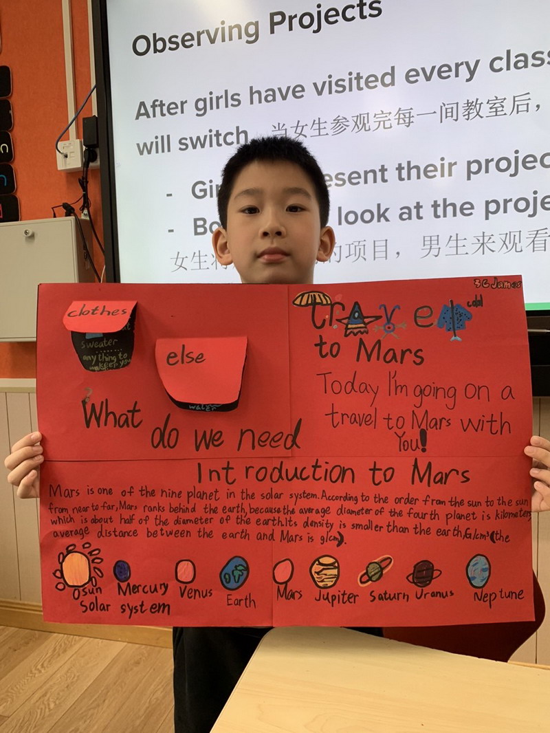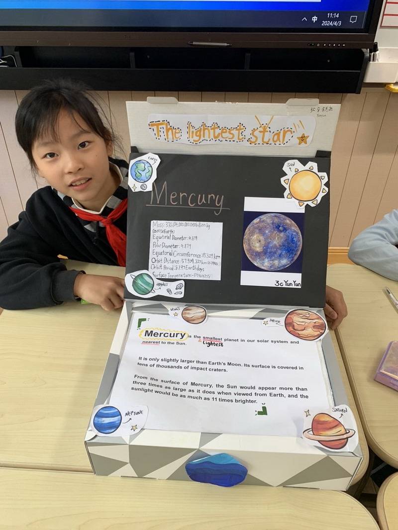 三年级的同学已经学习了“太阳系”主题,根据自己的能力和兴趣,每位同学都选择了自己的作品方向。有选择模型制作的、也有选择化身外星小导游,来介绍自己星球的、还有小朋友提出了课堂中没有讲到的但却很感兴趣的问题,并自己搜索资料,制作了一份详尽的海报。我们来看看小朋友们精彩的作品吧!