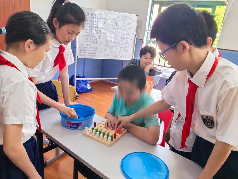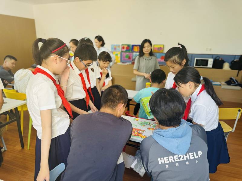 同学们在专业老师的指导下,也做了一次小志愿者,和这群“来自星星的孩子”亲密互动,教室里充满了欢声笑语。“原来孤独症和我们想的不一样,如果以后在公众场合遇见他们,我一定会帮助他们和和周围的人们解释!”
