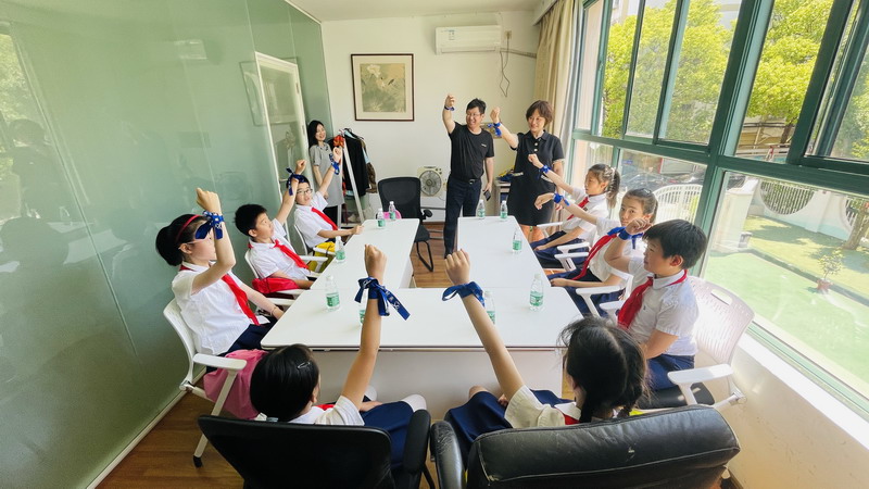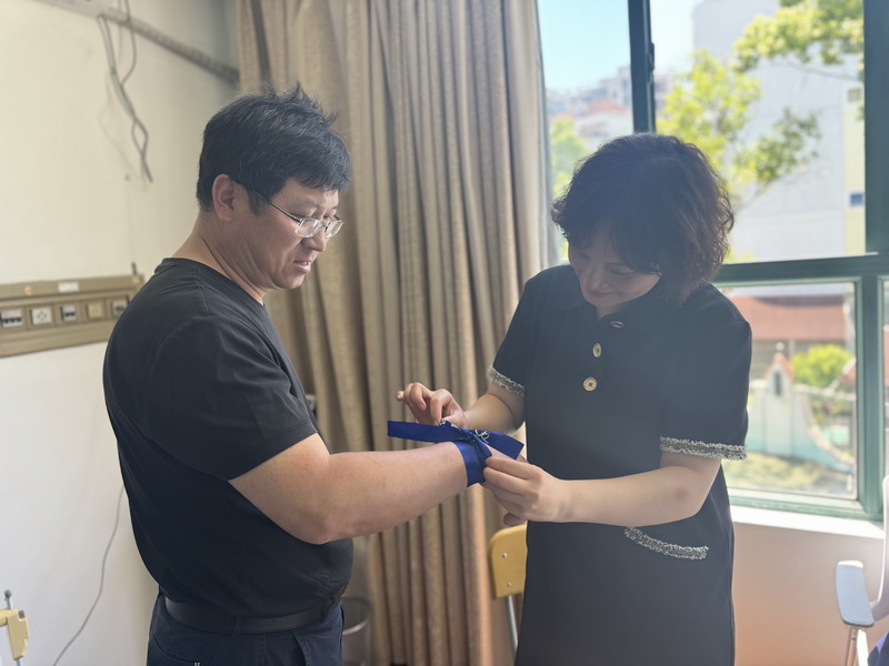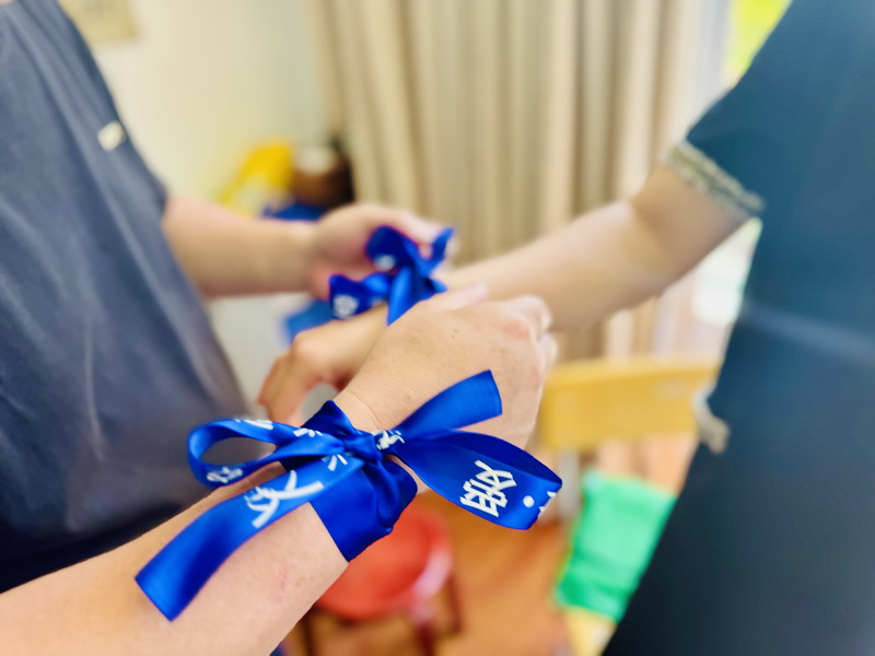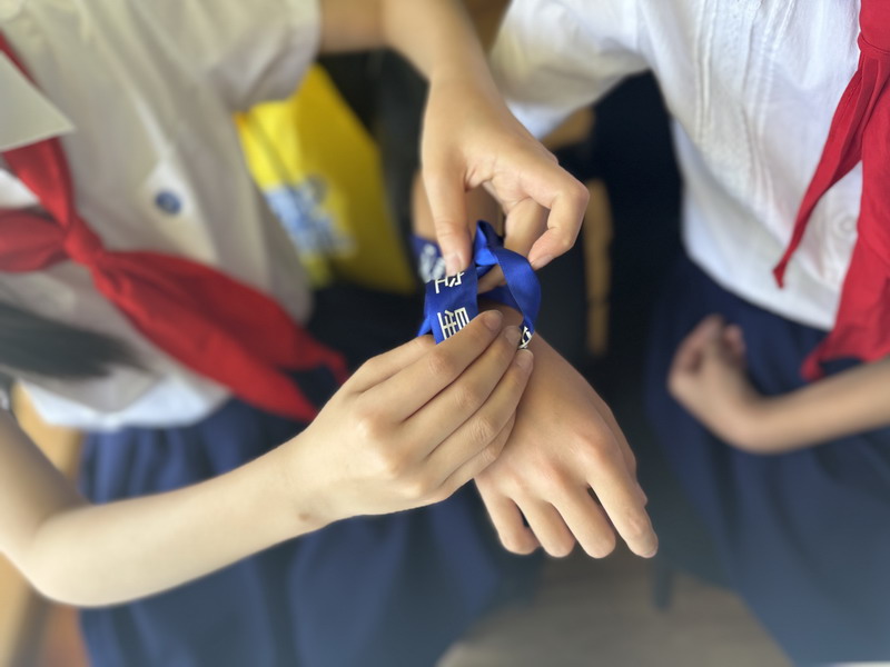 最后,同学们相聚会议室,和老师一起系上蓝丝带,共同承诺——“爱,让星空蓝起来”!