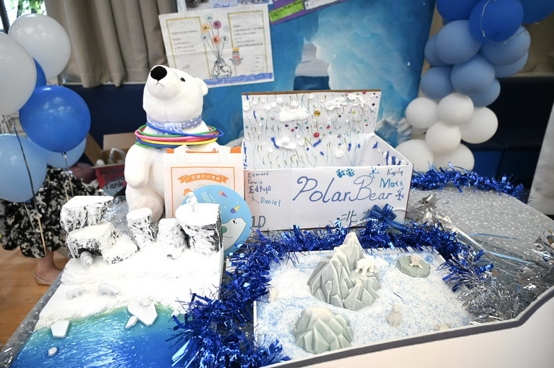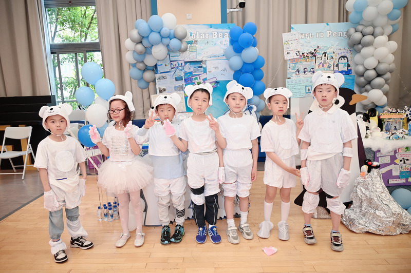 一D班的宝贝们装扮成极地动物——北极兔、北极熊、虎鲸和企鹅,展示身极地动物的生存智慧。