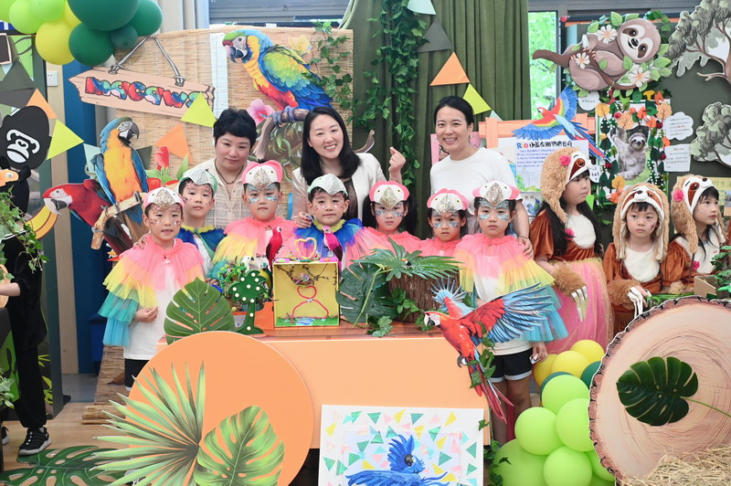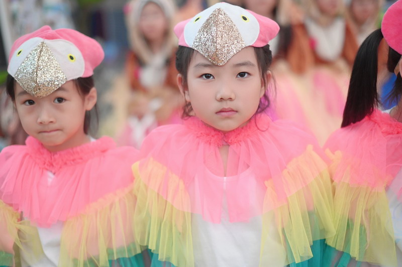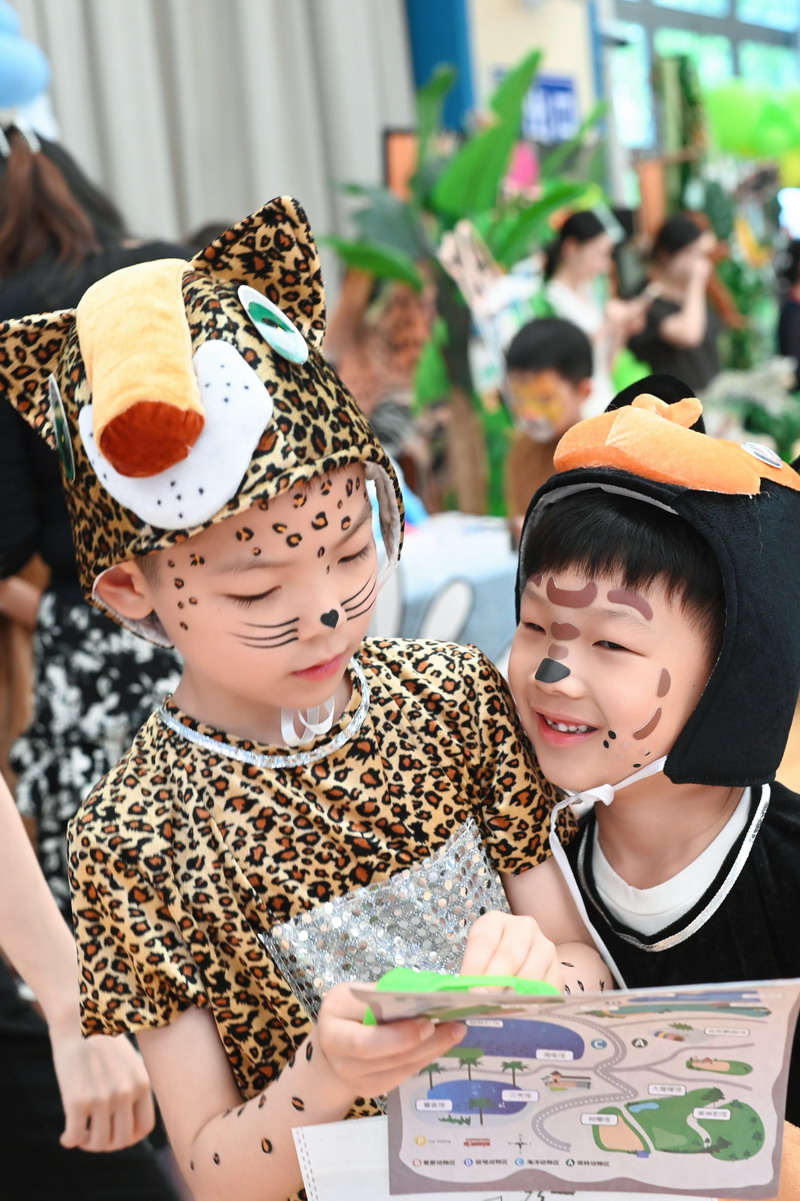 一B班的孩子们扮演森林动物——大象、狮子、长颈鹿和豹子,展现原始森林动物特有的魅力。