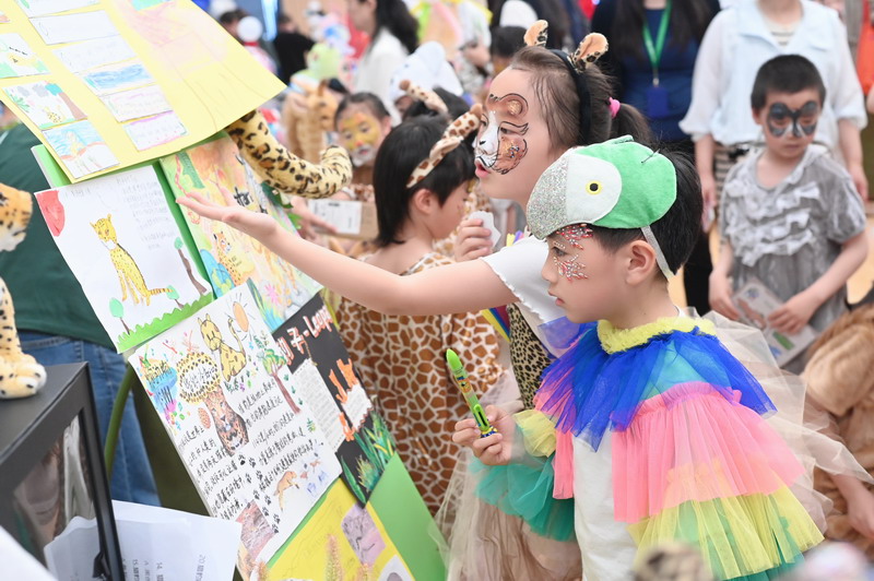 学习活动中,学生们像科学家一样探索未知:在自然博物馆中感受动物的栖息地,在春游考察中领略动物的本领,综合运用多个学科知识探究动物奥秘。学生们像社会学家一样关注自然:在“四月二十二日”世界地球日这天,学生们呼吁大家保护野生动物,守护地球家园。学生们像艺术家一样创意表达:在美术课上,用画笔绘制活灵活现的动物头饰;在科学课上,给野生动物做栖息地;在形体课上,用自己的形体栩栩如生展现各种动物的身姿。接下来,请大家欣赏学生们的舞蹈图片——爪爪舞。