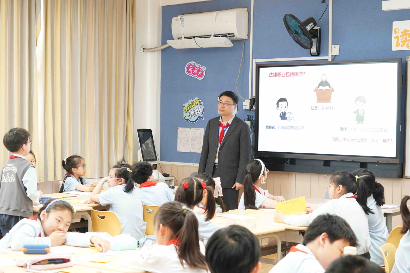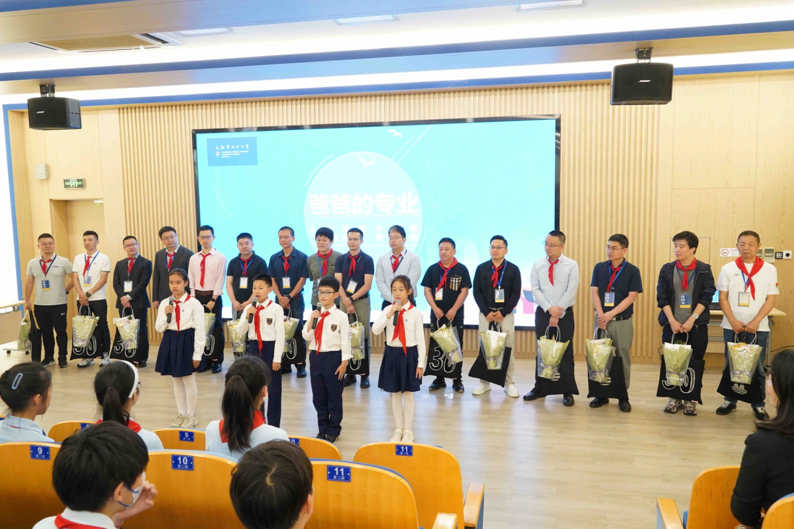 一早,四年级同学们精神抖擞地齐聚电教室,活动正式开始。各位爸爸上台分享自己的专业领域和讲座主题,接受了学生代表献上的最崇高的敬意。