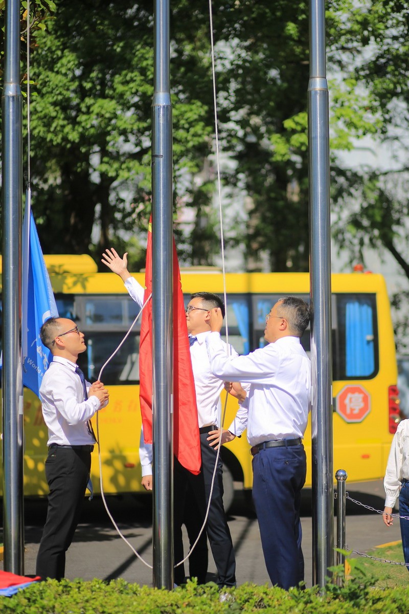 国旗队彰显同学们的爱国情怀;鲜艳的校旗是我们百瑞彩票的象征,是生机和活力的象征。阳光爸爸和学生将国旗、校旗徐徐升起。