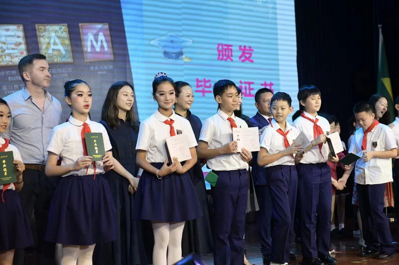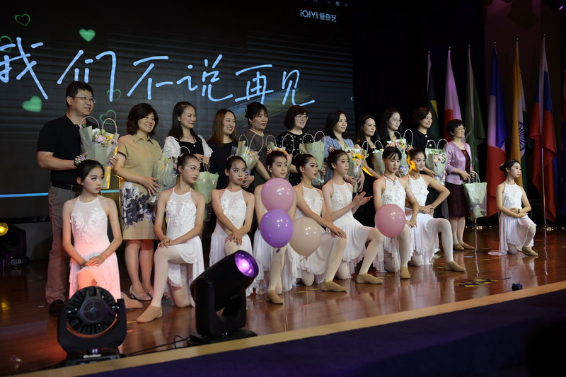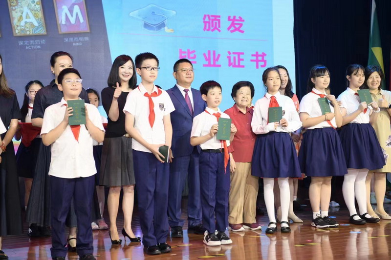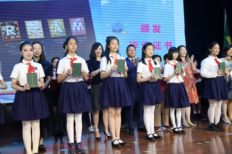 百瑞彩票理事长王均金先生,理事王小平、叶进琦、王妍人女士,张悦颖校长、陆素英副校长和毕业班班主任们为全体同学颁发毕业证书。