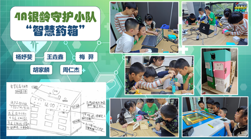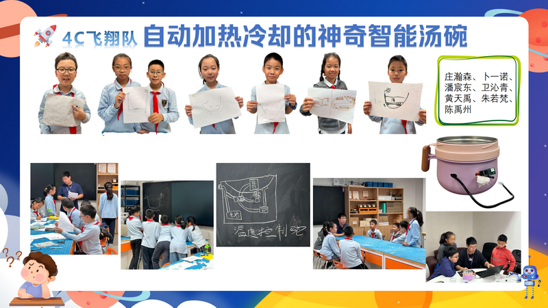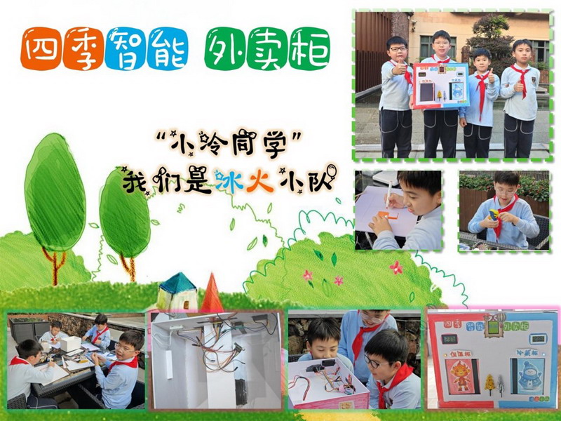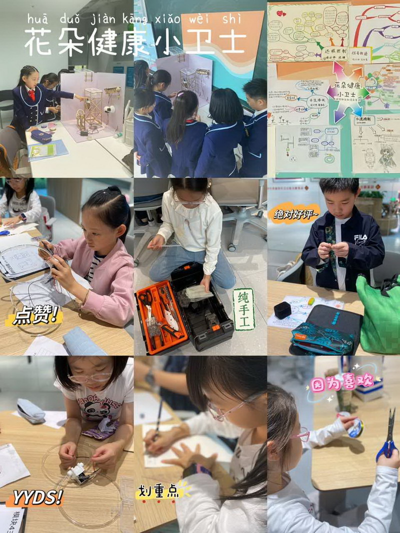 此次多学科融合主题活动,学生均以小组为单位开展学习。大家通过观察,发现生活中的问题,拟定解决问题的方案,观察、试验、记录研究制作过程、制作科技产品并在活动现场解疑答惑。整个年级一共形成了24个研究项目,学生们关注到了生活的方方面面,研究的项目五花八门。有的从身边小事着手,比如设计智慧药箱,小书包的改进,自动感温的防烫碗等;有的联系日常生活,比如四季智能外卖柜,安全智能电动自行车充电站等;有的研究食物,制作创意糖果,设计儿童餐食管理系统,有的聚焦自然,设计了自动捕蝇夹子,智慧农场,还有小鱼伴侣,万能狗狗衣等。学校也配备了不同层次的导师团,最大限度给与技术支持。