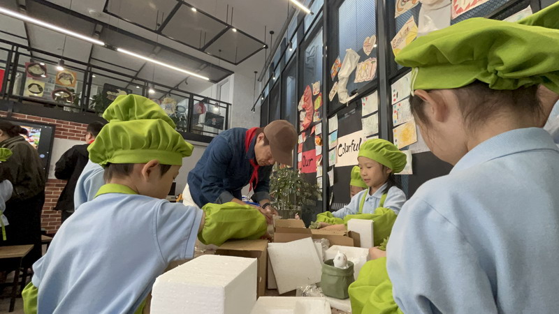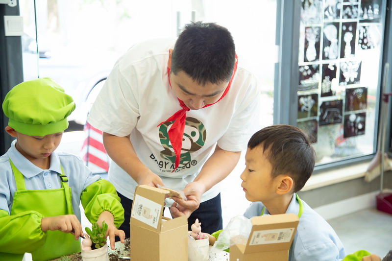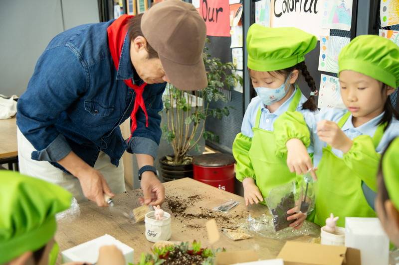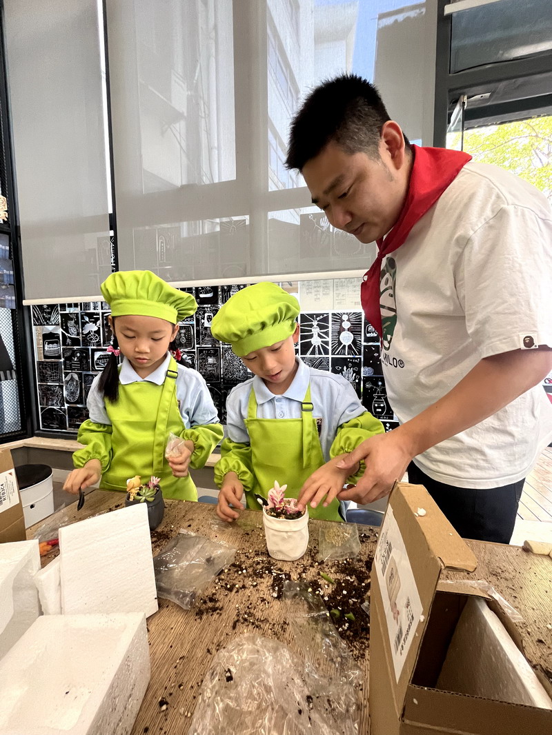 爸爸们的“劳动魔法秀” 园丁爸爸带着孩子们,教他们怎么种花。孩子们拿着小铲子,跟着爸爸一起种植、浇水。园丁爸爸一边示范,一边讲解:“种多肉可不能马虎哦,阳光和水分都要恰当,很小心。”孩子们听得津津有味,小手也一刻没停,一盆盆漂亮的花儿在他们的努力下“安家落户”。