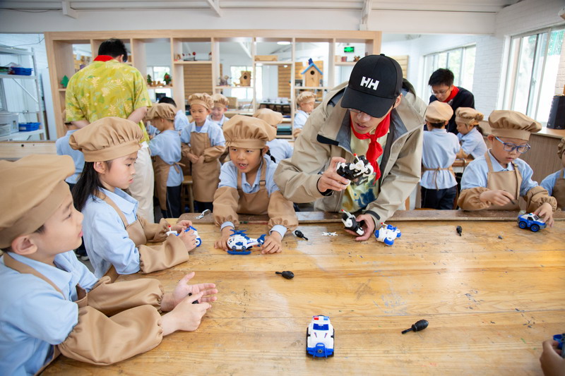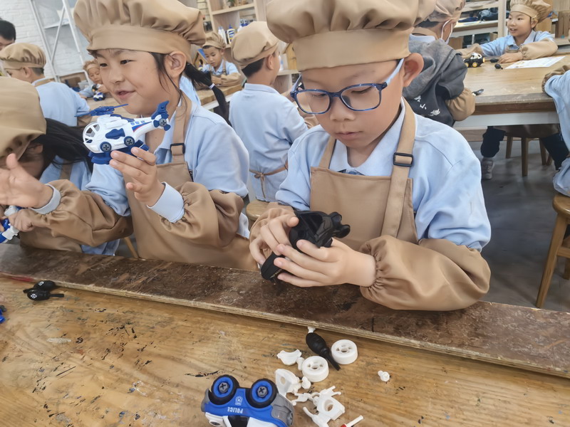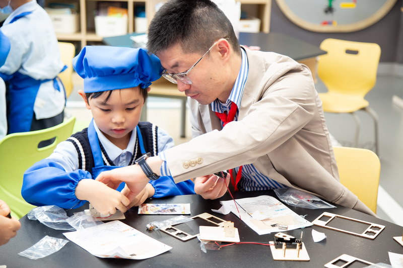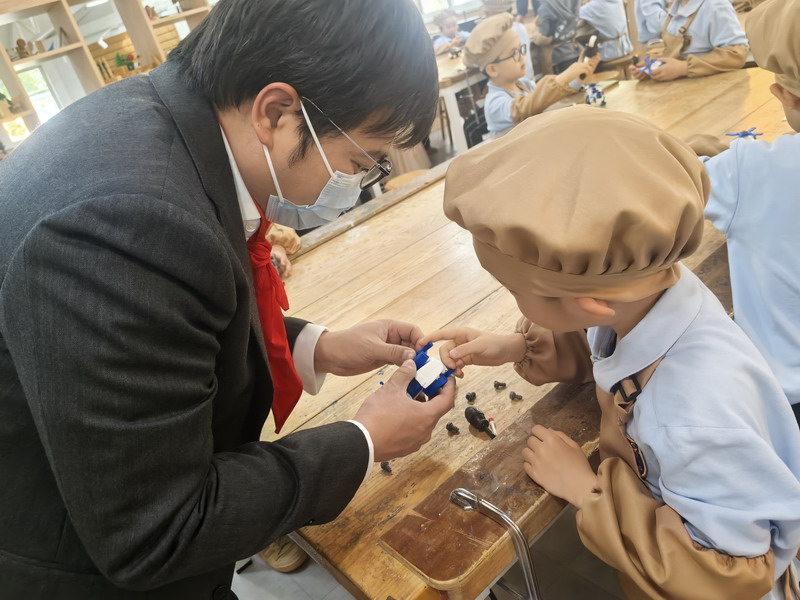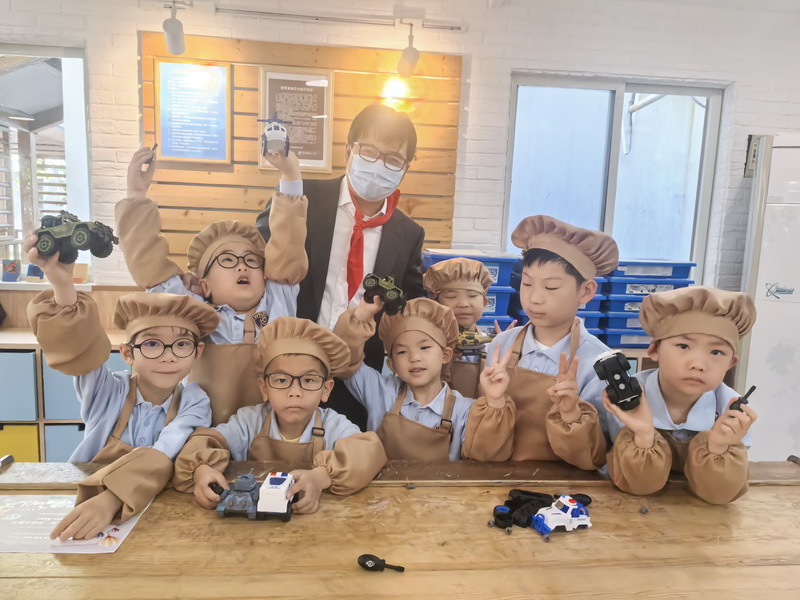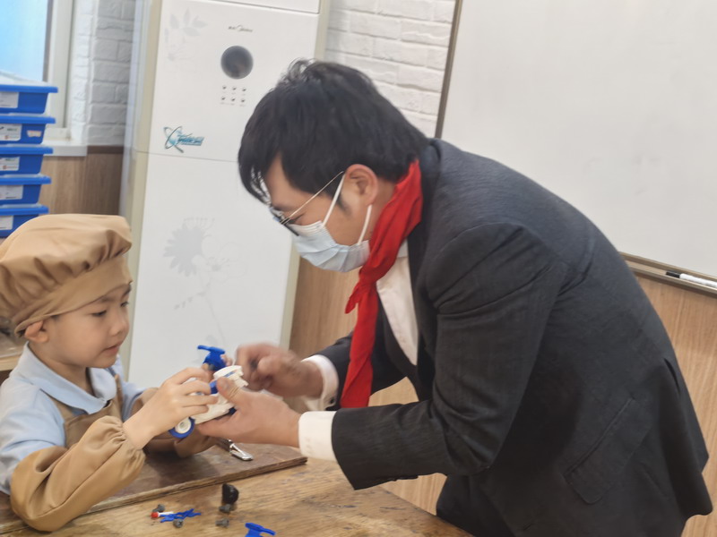 工程师爸爸、DT爸爸带着孩子们来到 DT 教室、科学教室,给他们介绍神奇的劳动工具。孩子们的眼睛都亮了,这些平时看起来普通的工具,在爸爸的手里就像变魔术一样。爸爸们准备充分,用专业的知识朴实的言语一边讲解电的原理,工具的使用方法,一边提醒孩子们要注意安全。孩子们迫不及待地动手操作起来,一个个小汽车、小飞机被组装完成,一盏盏小灯泡被亮起,孩子们脸上的笑容,那份成就感油然而生,今天,一个个都成了“小小工程师”。