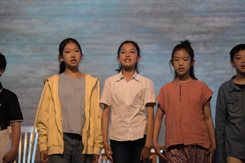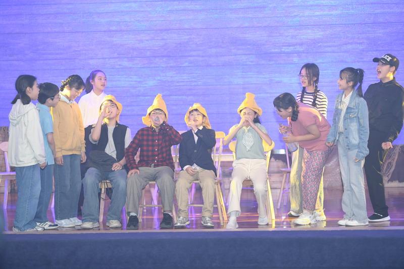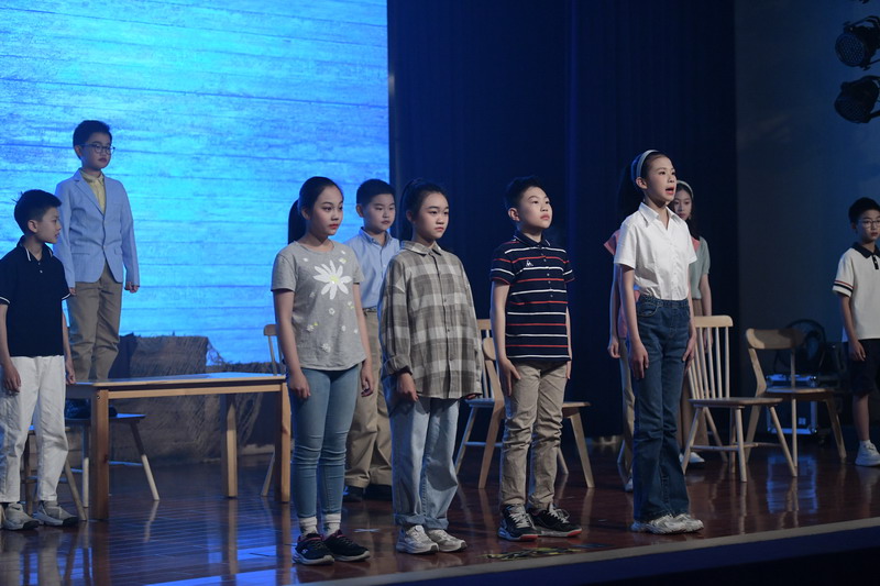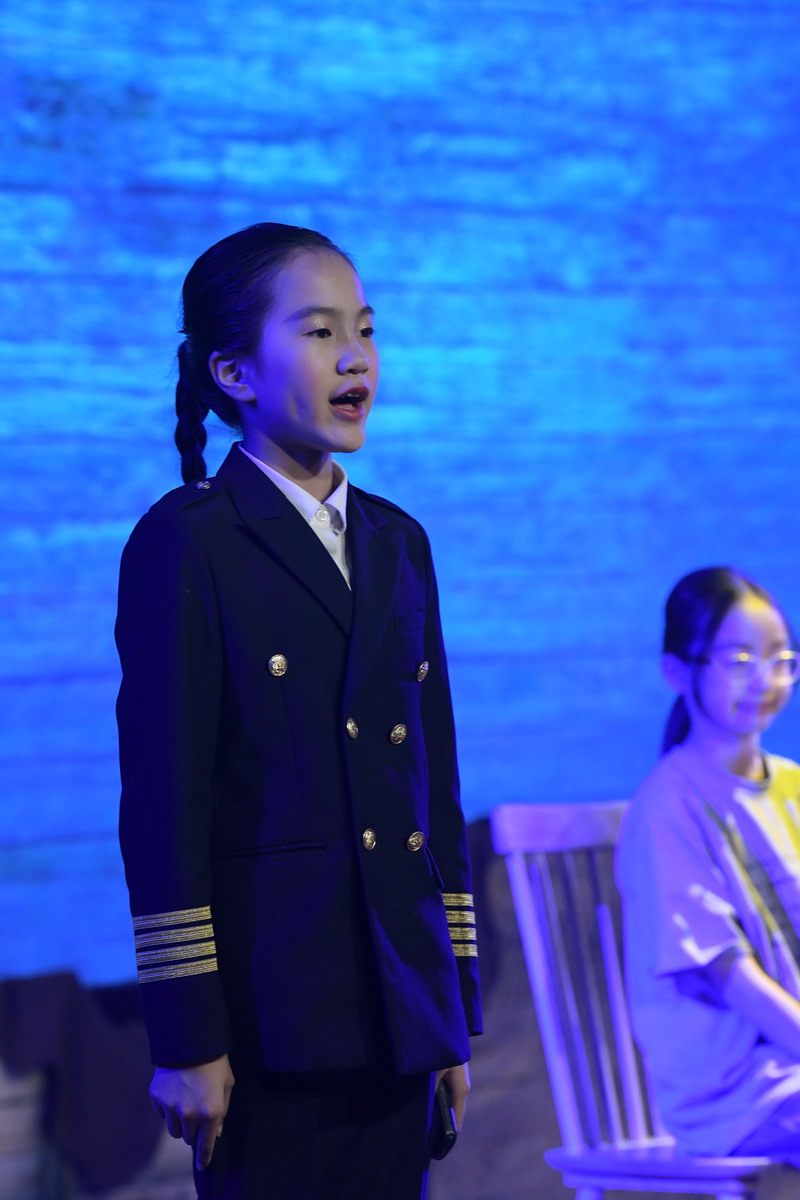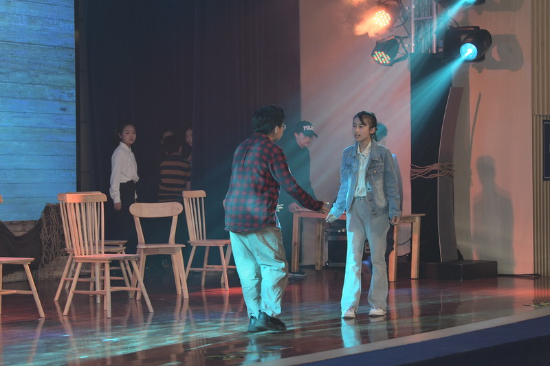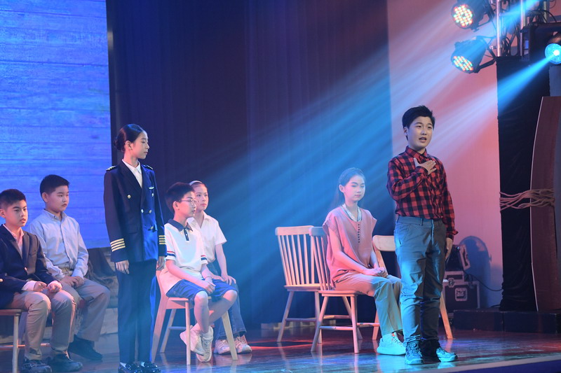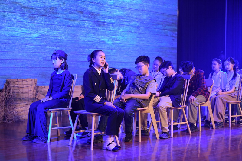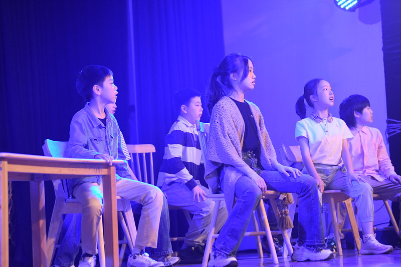 演出当日,15把椅子与105位演员巧妙化身为故事中的7000人,以简驭繁、以少胜多。借助音乐的渲染,寥寥身影亦营造出磅礴气势。舞台上,学生们各展所长、百花齐放,用醇正流利的英语台词与余音绕梁的歌曲联唱,为观看义演的师生、家长献上了一场视听盛宴,不仅充分展现了个人风采,更让观众深刻领略到戏剧艺术的独特魅力。