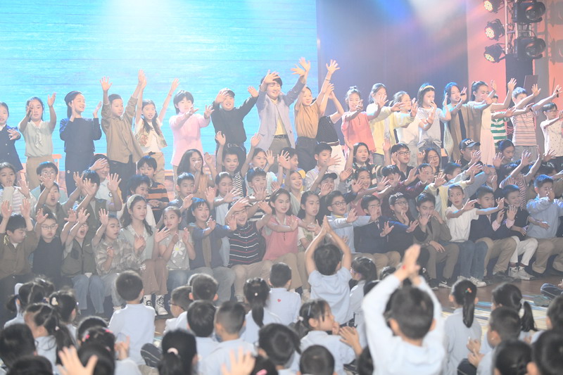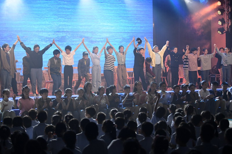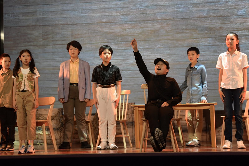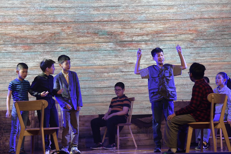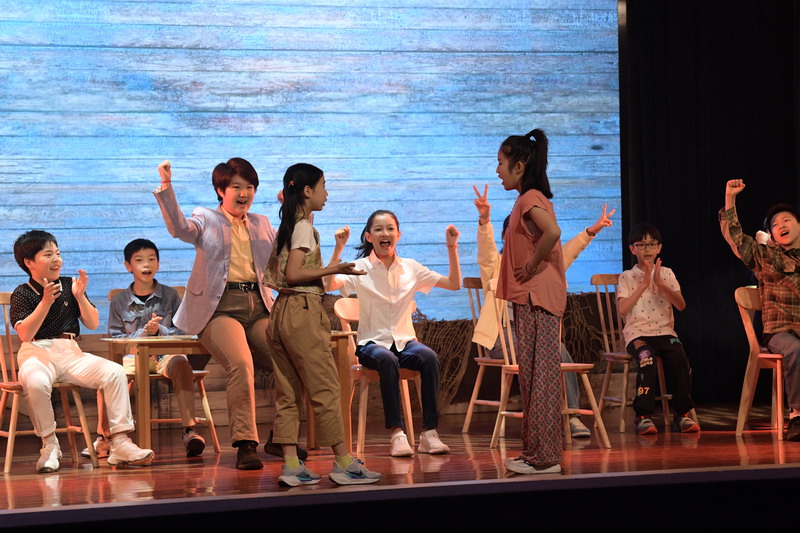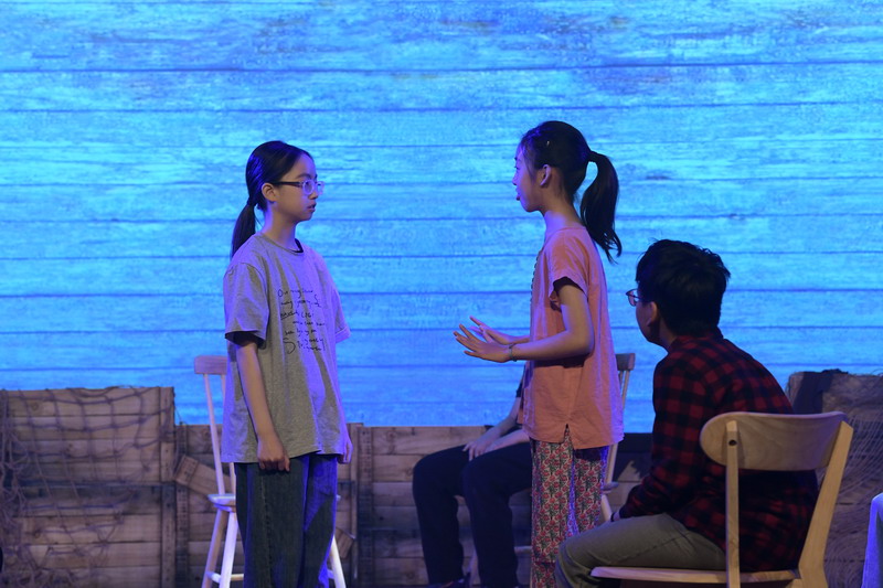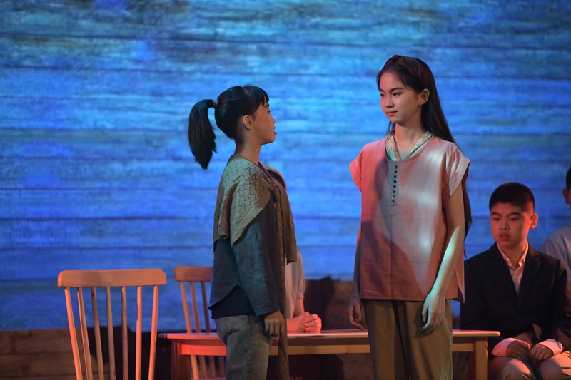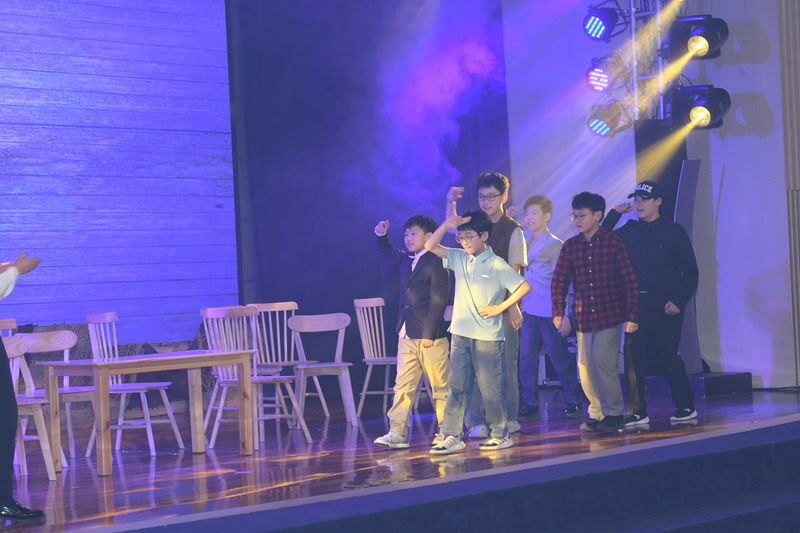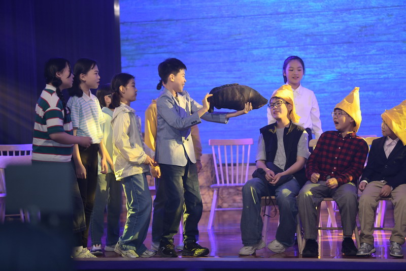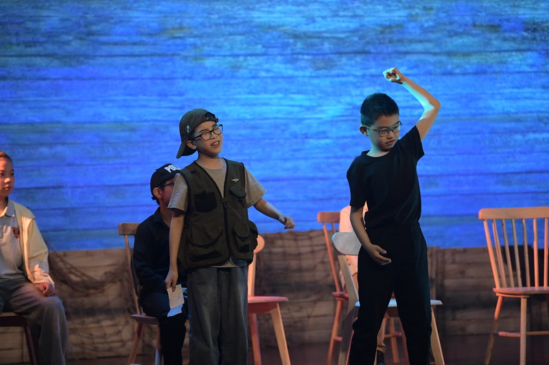 演出当日,15把椅子与105位演员巧妙化身为故事中的7000人,以简驭繁、以少胜多。借助音乐的渲染,寥寥身影亦营造出磅礴气势。舞台上,学生们各展所长、百花齐放,用醇正流利的英语台词与余音绕梁的歌曲联唱,为观看义演的师生、家长献上了一场视听盛宴,不仅充分展现了个人风采,更让观众深刻领略到戏剧艺术的独特魅力。