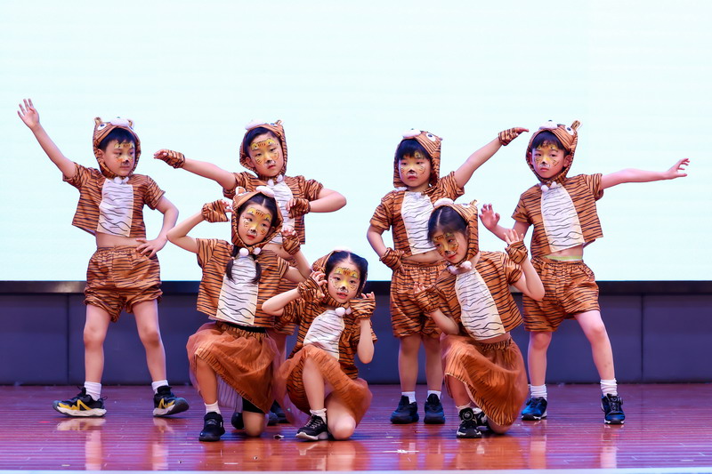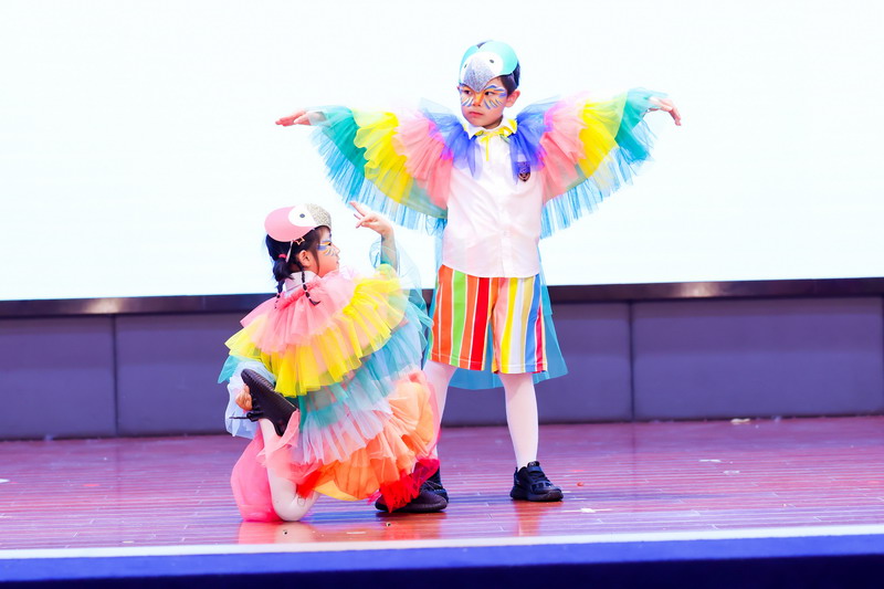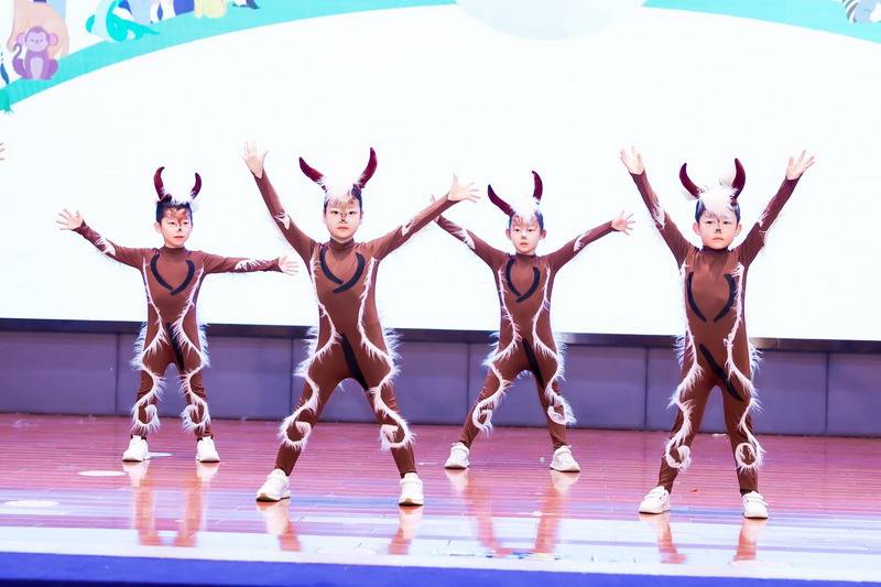 一A班的同学来啦!他们化身为热带雨林的鹦鹉、老虎、青蛙、蜘蛛,用舞蹈展示热带雨林动物的风采!