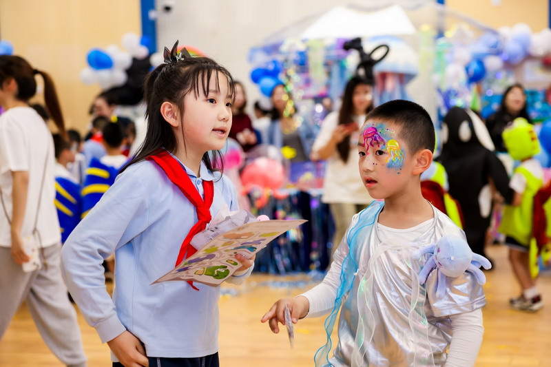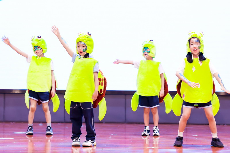 一C班的同学来啦!他们化身为海龟、水母、虎鲸和贝壳,一起畅游神奇的海洋世界。
