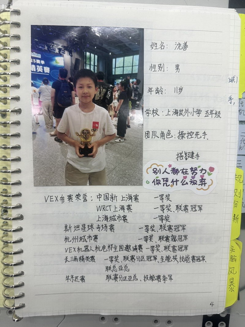 面对分区冠军、全球第五名的优异成绩,沈善既开心又骄傲,但他也保持着难得的清醒与谦逊。他清晰地看到了与世界顶尖水平的差距,这为他指明了未来精进的方向。他为自己规划了清晰的成长路径:在机器人结构设计、编程逻辑的严谨性、工程记录的规范性以及团队协作的默契度上,都需要持续投入。他计划针对薄弱环节进行强化训练,并积极向顶尖团队学习高效的时间管理和精细的技术处理经验。此刻,他已满怀期待地将目光投向了更具挑战性的目标——2026年机器人世锦赛初中组赛事,准备开启新的征程。