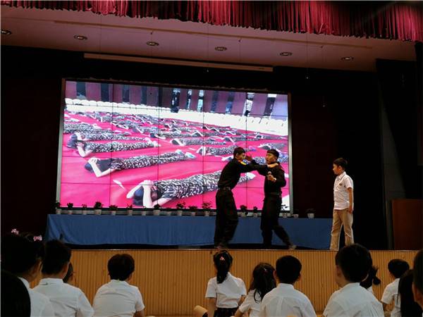 在开学典礼上,学校还特别邀请到了中国最权威的专业的安全教育培训、防卫技术输出机构。北京建强防卫的专业教官:齐教官、张教官、白教官。为大家讲解并演示"安全防卫知识和有效的防卫技能"。帮助大家增强正确的安全意识和保障自己的人身安全。通过专业教官的展示和同学之间的互动,让学生们懂得"防而不伤,卫而有度"的道理。