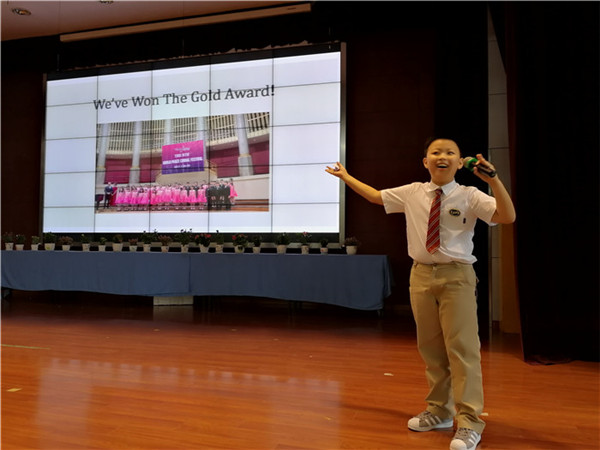 暑假里,PYP部学生四十余名合唱团学生代表学校参加在维也纳举行的"世界和平音乐节"荣获了金奖。学生代表周致远和宋媛惜上台和大家一起分享了此次出国参赛演出的一些经历和心得。