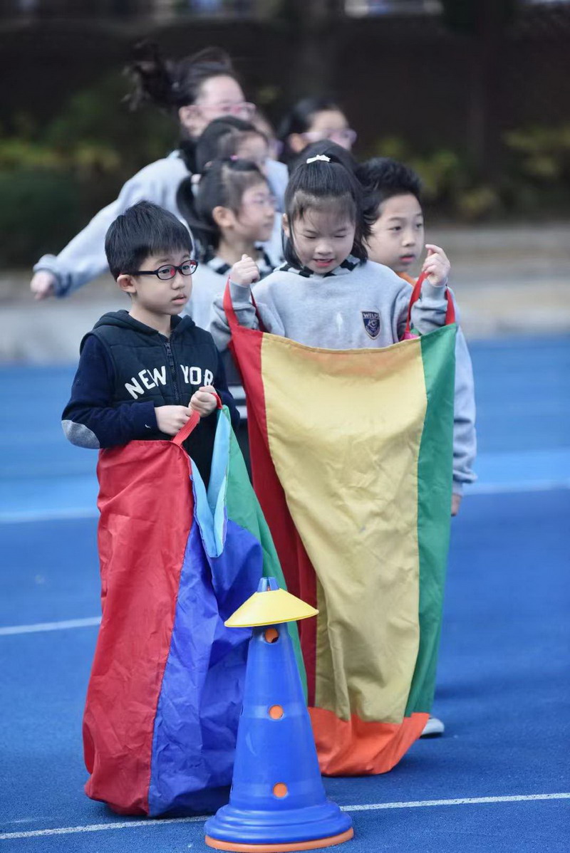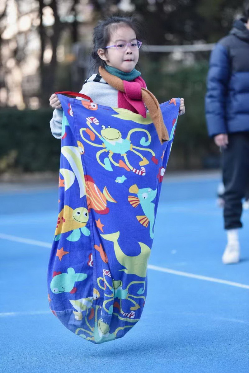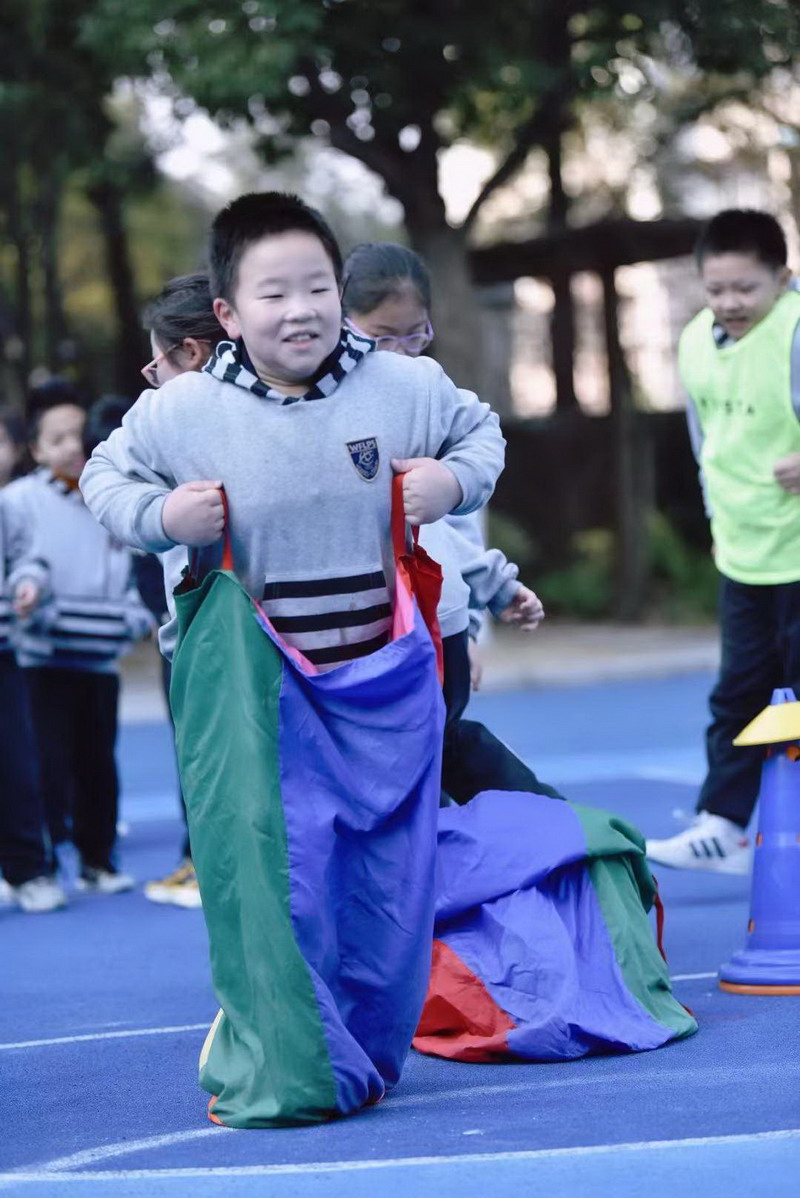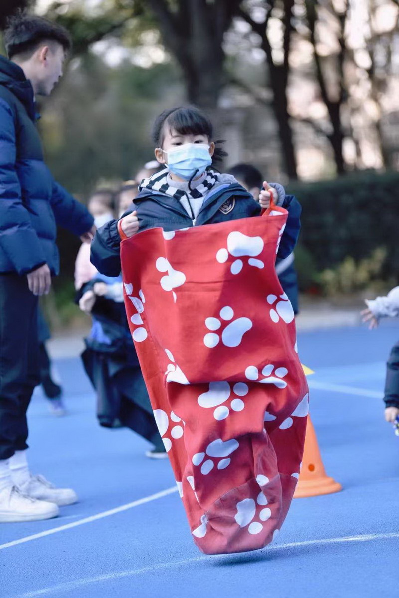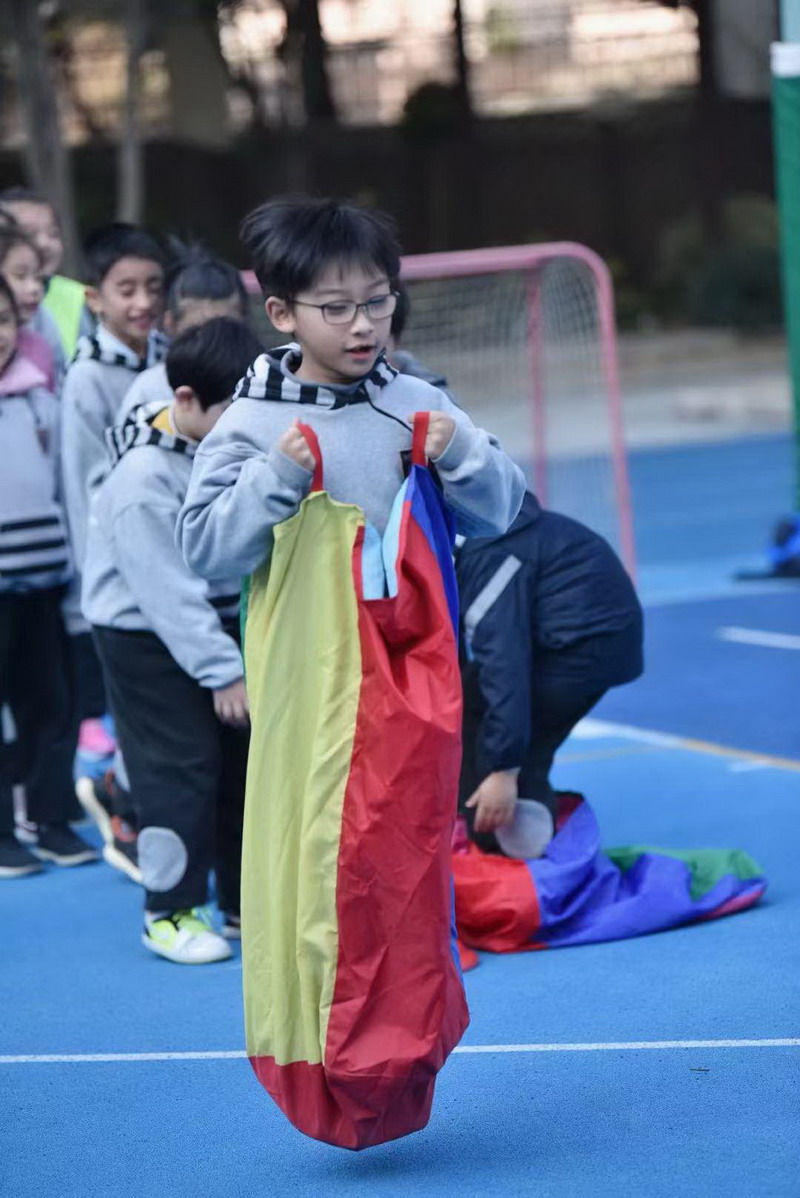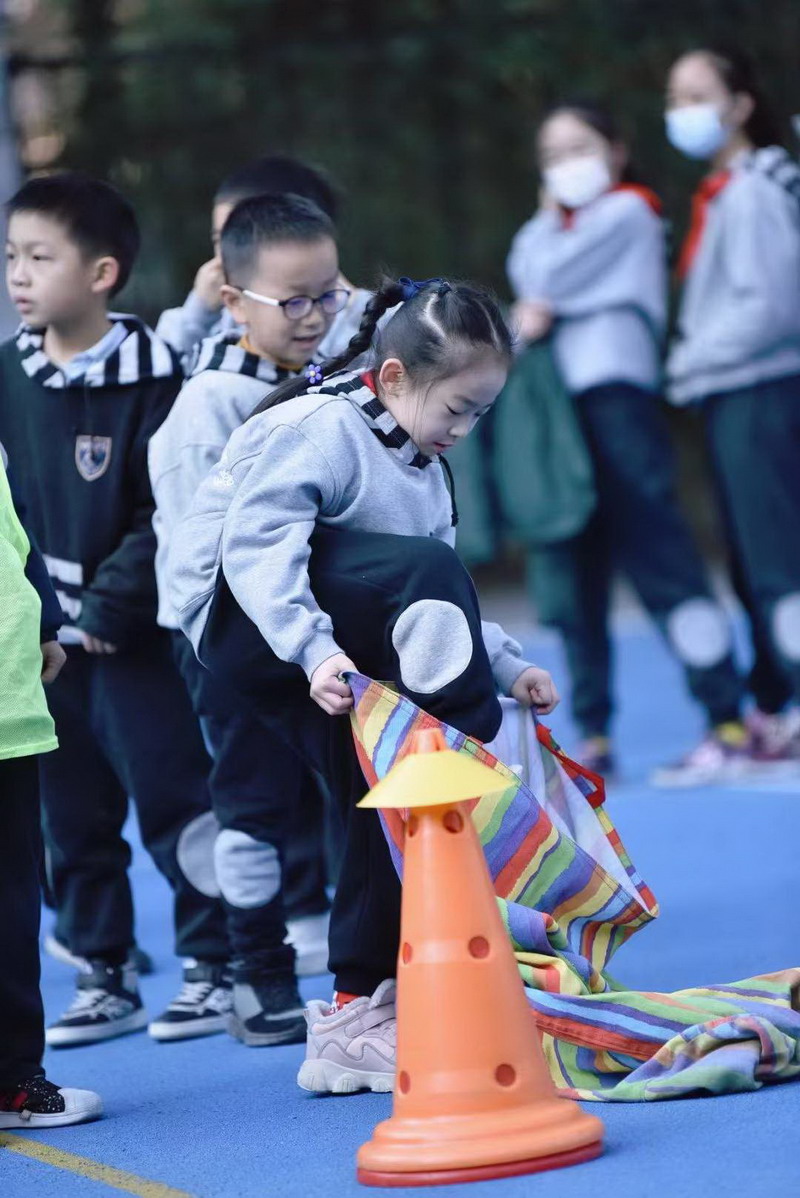 瞧!一二年级的同学们蹦蹦跳跳,像一只只灵活的袋鼠往返于赛场。