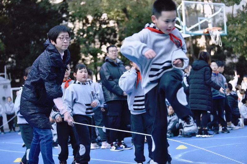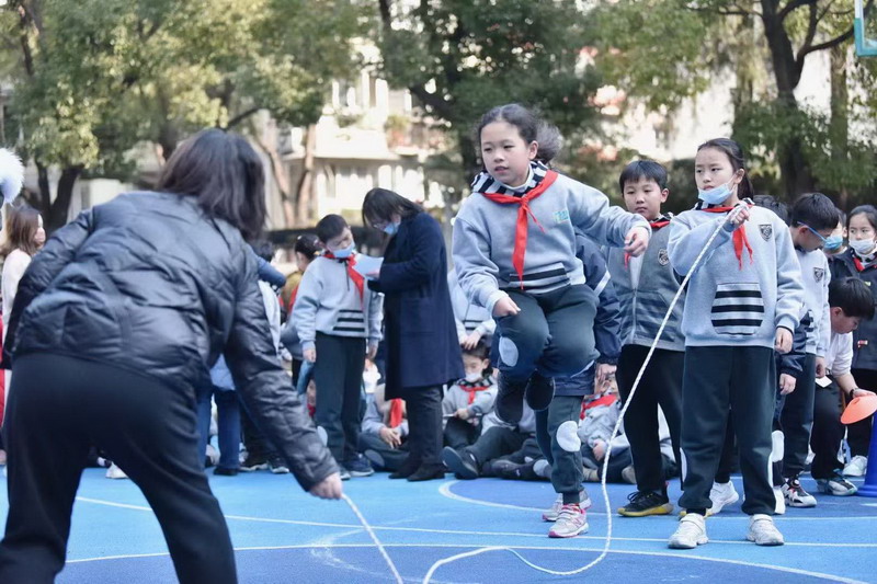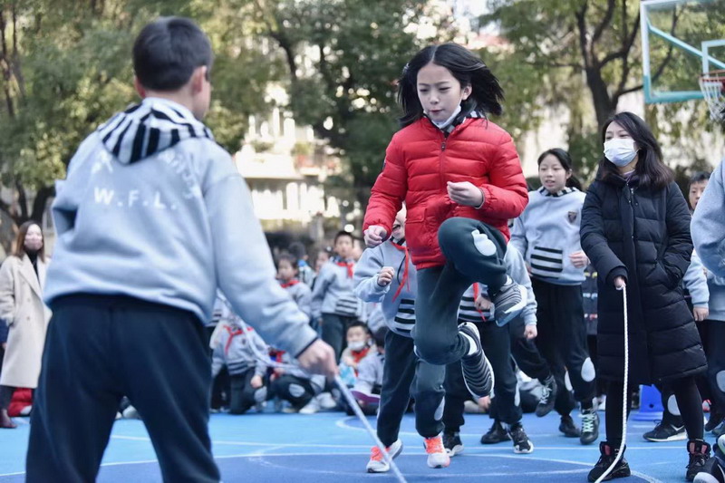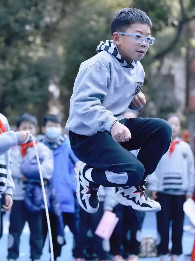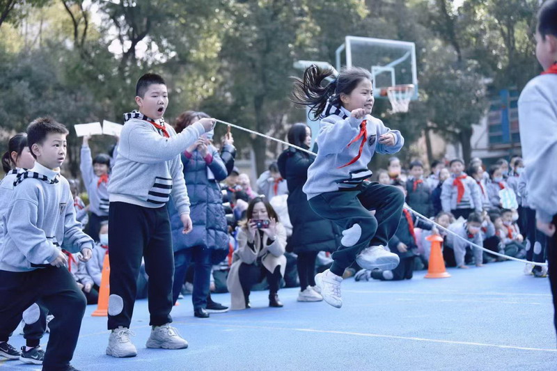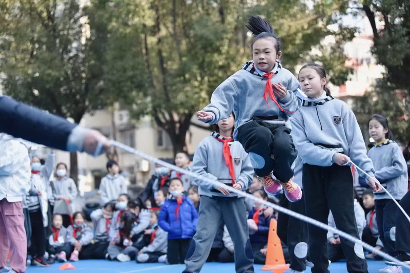 挥动的长绳如银蛇飞舞,比赛选手们身轻如燕,动作敏捷,来回穿梭。师生间摇绳跳绳配合默契,场外啦啦队挥臂呐喊,为运动员们加油。