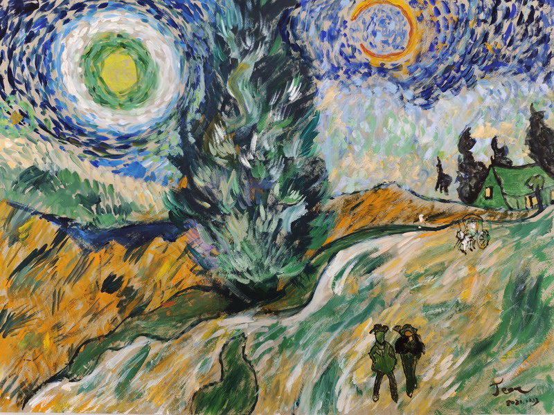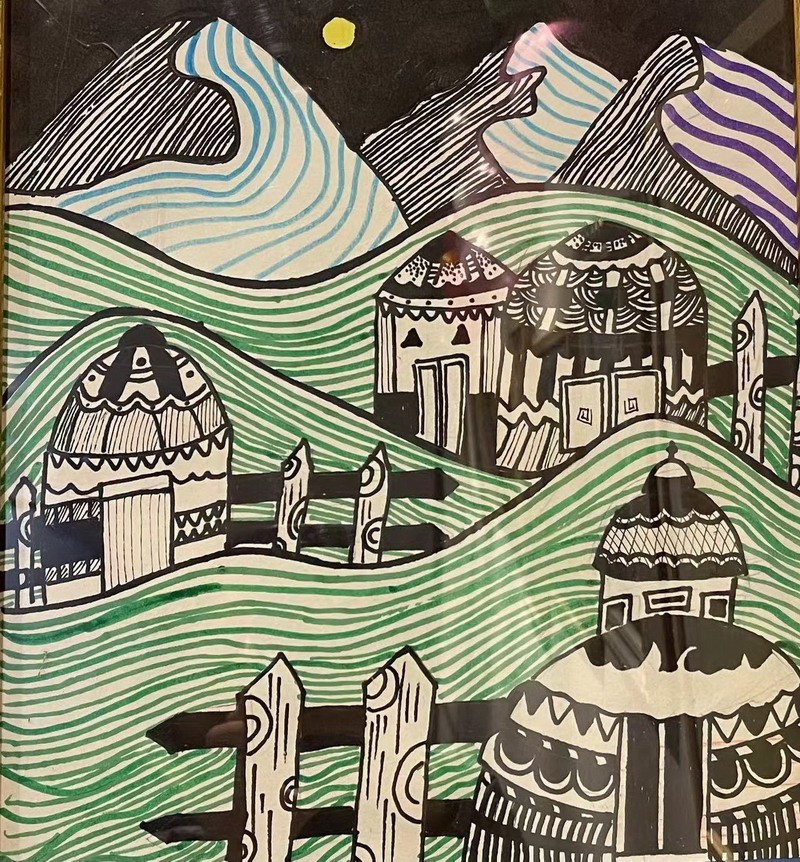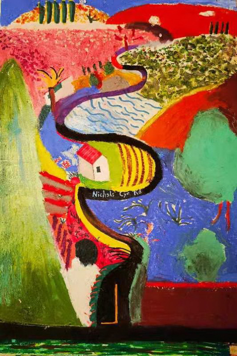 今天我想给大家重点介绍一下这幅风景画作:《尼科尔斯峡谷》,它是霍克尼爷爷最伟大的杰作之一,表达了他对自然风景无止境的探索。我在临摹这幅画时尝试探索了不同的艺术技巧和材料。我作画时选择了油画棒、彩铅、马克笔三种不同的画材组合完成。其中,油画棒用来表现浓厚鲜艳的大色块,彩铅用来勾画长线条,勾画出类似中国画中的“移动焦点”的透视,马克笔用来刻画局部的细节,我希望能还原这幅画强烈的视觉冲击力与创造力。