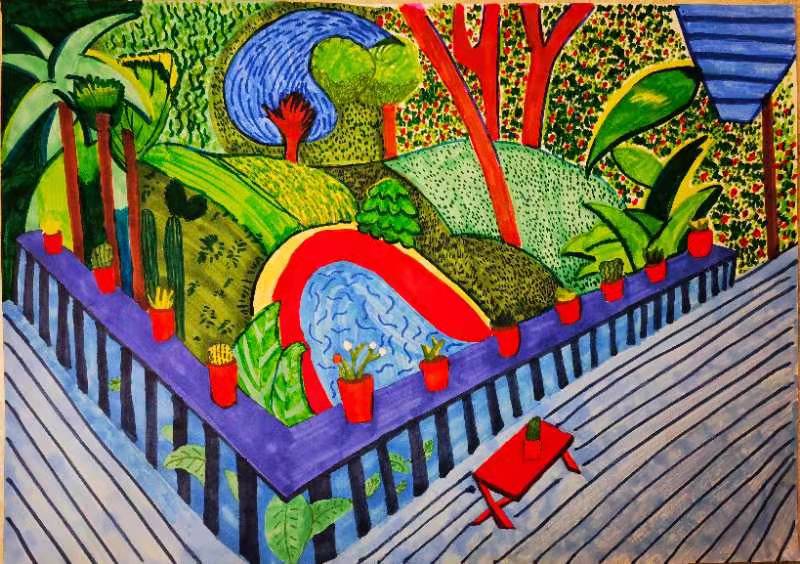 “瓶中花卉”单元是四张形态各异的瓶花景物,使用彩铅与马克笔结合的方式,表现花朵的五彩斑斓与花瓶的质感。感悟微观世界之温柔。“色彩房间”单元中的五幅作品是大卫·霍克尼标志性的杰作,室内作品是画家的个人房间,充满艺术感。而室外庭院中有叶落水塘、开满花的树,一切都如诗般美好。“移步换景”单元由两幅风景画作品组成,麦田与房屋交织,刻画这些景物时,仿佛自己也置身在静谧的乡野。