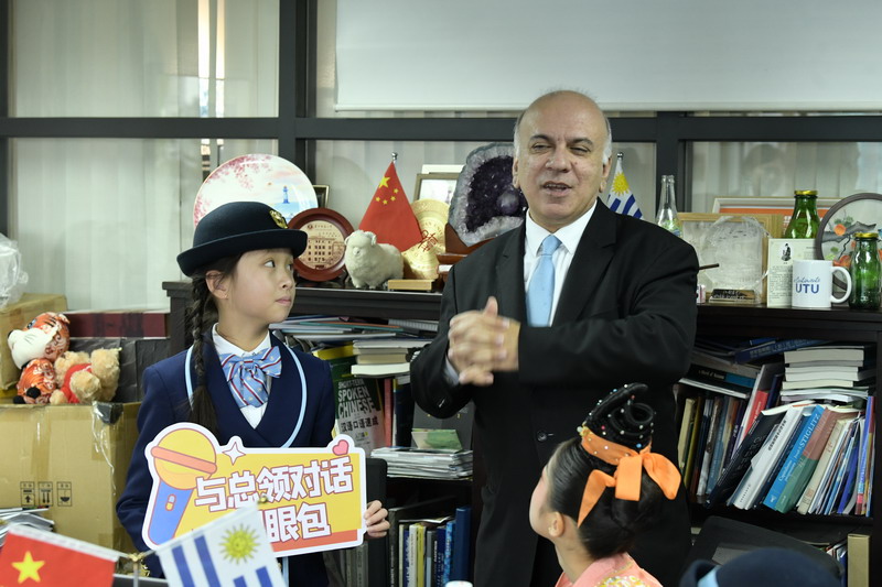提问时间,孩子们化身“小记者”,以流利的英语夹杂着刚入门的西语提问:“乌拉圭的孩子们最爱过哪个节日?”“足球如何能成为国家的名片?”......总领事仔细地听着,认真地回答,不时为这些小小访客的视野点头赞许。这一刻,孩子们的好奇心终于得到了释放。