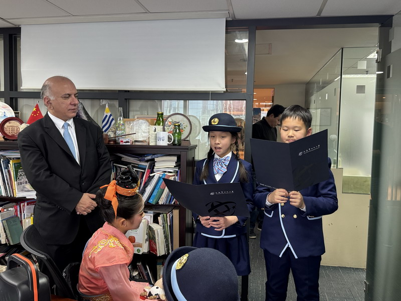 临别时,孩子们送上特别的礼物,亲手绘制的中乌主题画作。在孩子们的画笔下,中国的长城与乌拉圭的名胜相依,一群国宝大熊猫正在蒙得维的亚的海滩上快乐地嬉戏。这些天真烂漫的绘画,正是他们献给中乌建交七十五周年最纯真的祝福。