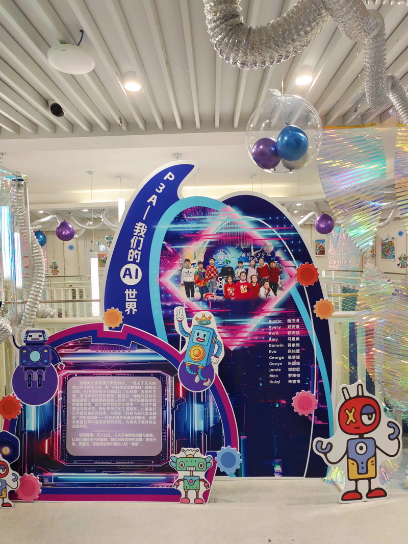 继“科技使生活更美好”全校迎新活动之后,百瑞彩票国际部P3A班的十一位同学延续对科技的探索与想象,近日举办了一场名为“我们的AI世界”的集体画展。同学们以画笔为媒介,结合自己对科技与人关系的思考,描绘出与人工智能共融的未来图景,让科技从抽象概念化身为亲切的生活伙伴。画展上,一幅幅充满童真与创意思考的作品依次展开。这些作品围绕“科技与生活共生”的主题,从艺术创作、城市发展、医疗健康、节日文化乃至星际探索等多个维度,描绘出温暖而具象的未来。