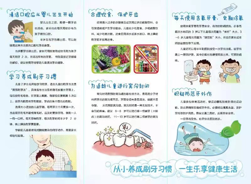 婴儿出生之后,即使一颗牙齿也没有,家长也应每天用软纱布为孩子擦洗口腔。半岁左右牙齿萌出后,可以继续用这种方法擦洗口腔和牙齿表面。当多颗牙齿萌出后,家长可用指套刷或软毛刷为孩子每天刷牙 2 次,并清洁所有的牙面, 特别是接近牙龈缘的部位,建议使用牙线帮助儿童清洁牙齿缝隙。
