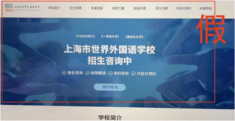 近日,我校发现有不法分子建立以“上海市世界外国语学校“为名的网站非法开展招生咨询活动。为了避免广大家长和学生受骗,我校郑重声明如下: