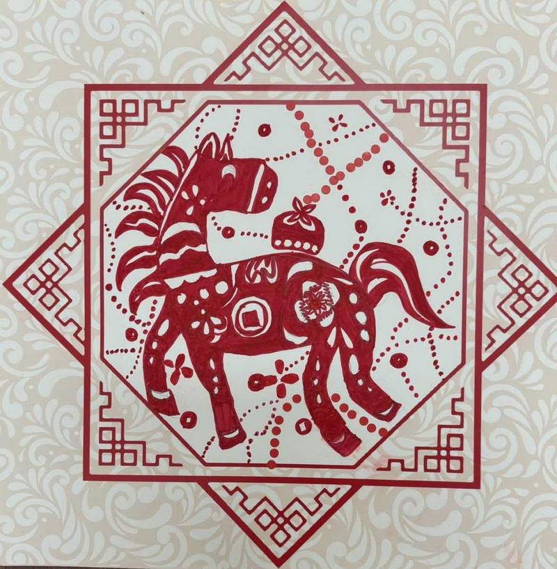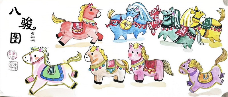 这一类作品最有“年味”和“文化感”。同学们从中国传统艺术中寻找马的形象: