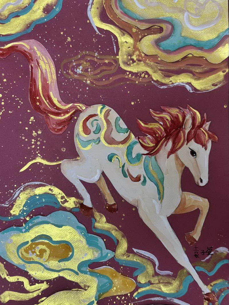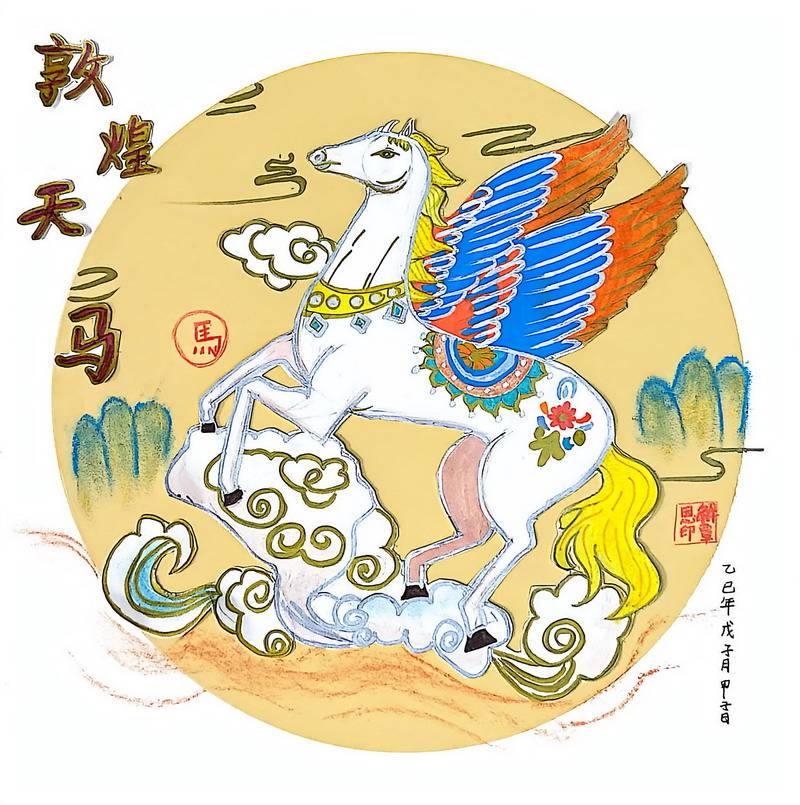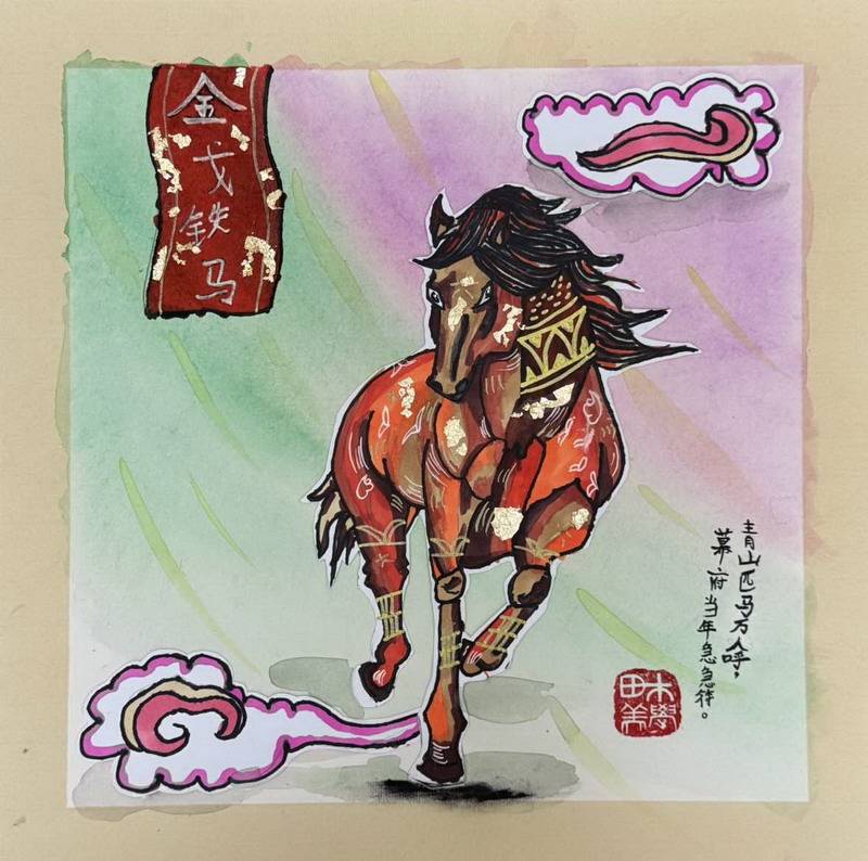 有的借鉴剪纸的镂空与对称,把马做成喜庆的红;有的吸收敦煌壁画的色彩与线描,让马带着壁画的庄严与华丽;还有的把甲骨文、古文字的符号感融入画面,让马像从历史里走出来——古朴、克制,却很有力量。