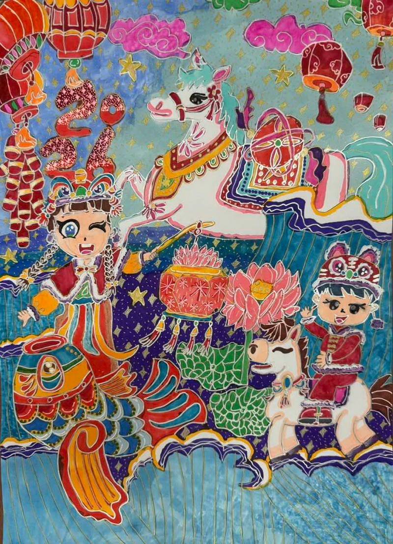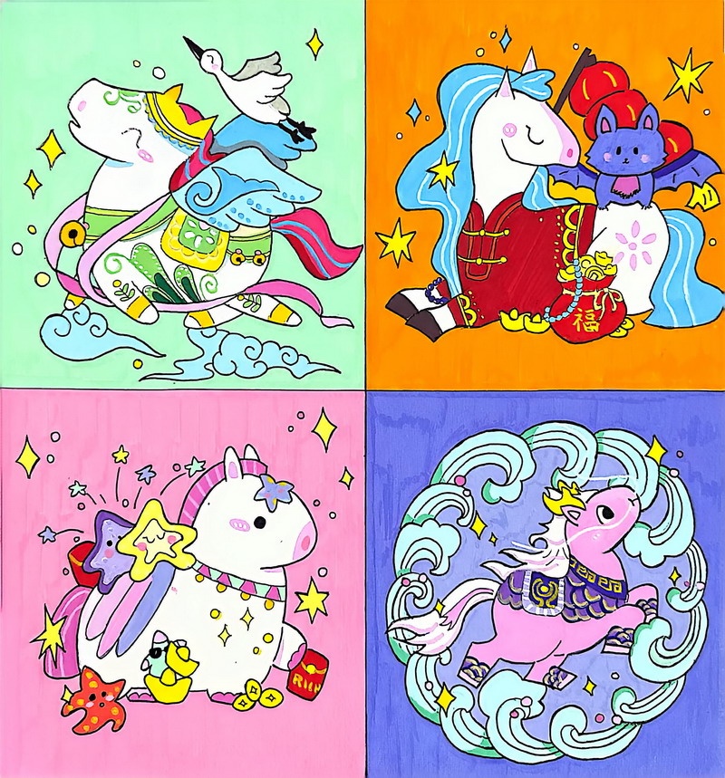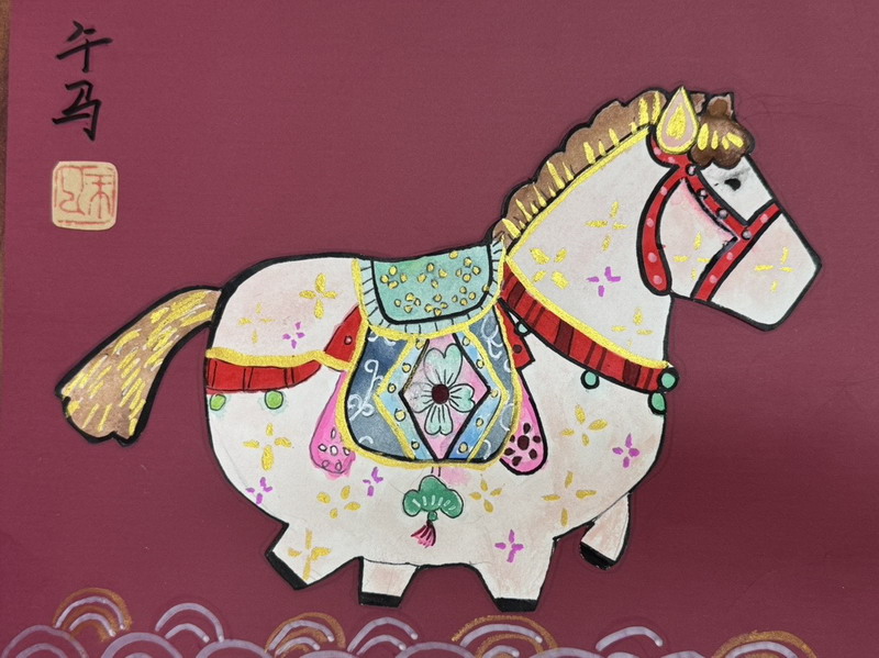 有的用波点、条纹、几何纹样让马变得现代;有的用花卉、云纹、民族图案让马更有装饰性;也有人把“新年元素”藏进图案里——烟花、元宝、福字等,都成为孩子们在临摹中悄悄塞进去的惊喜。