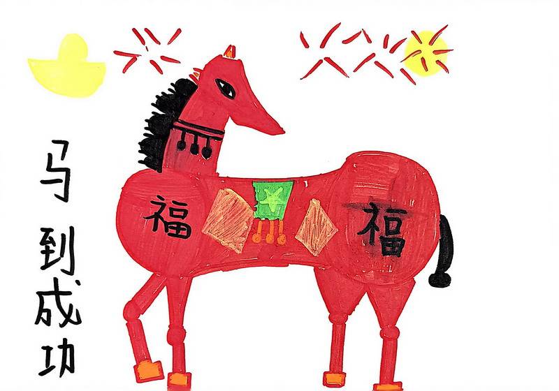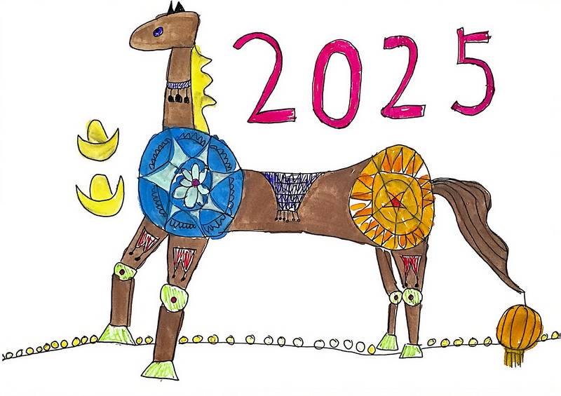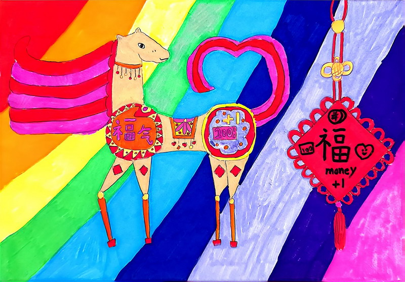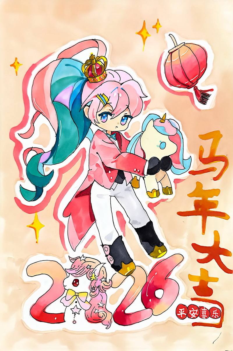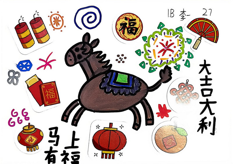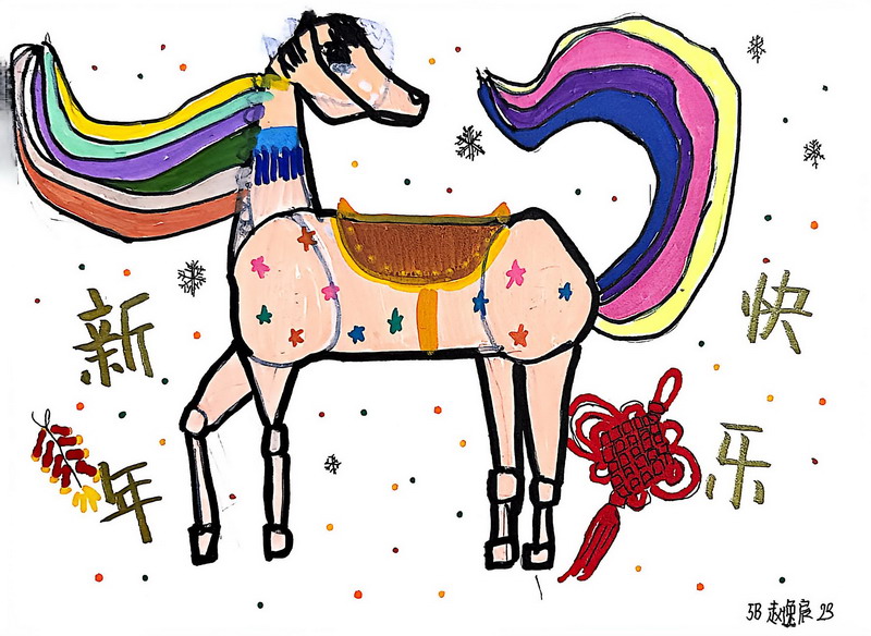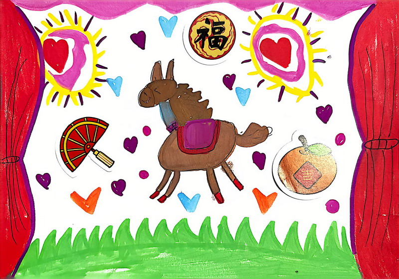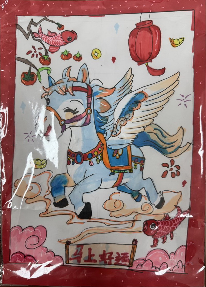 “马”本身就是吉祥的象征,而这一类作品把祝福写得更直观:同学在画面中加入新春祝福语,让马成为“祝福的载体”。这些作品不光一眼喜庆,细看更能感到孩子们对“新年”“吉祥”“愿望”的认真想象。