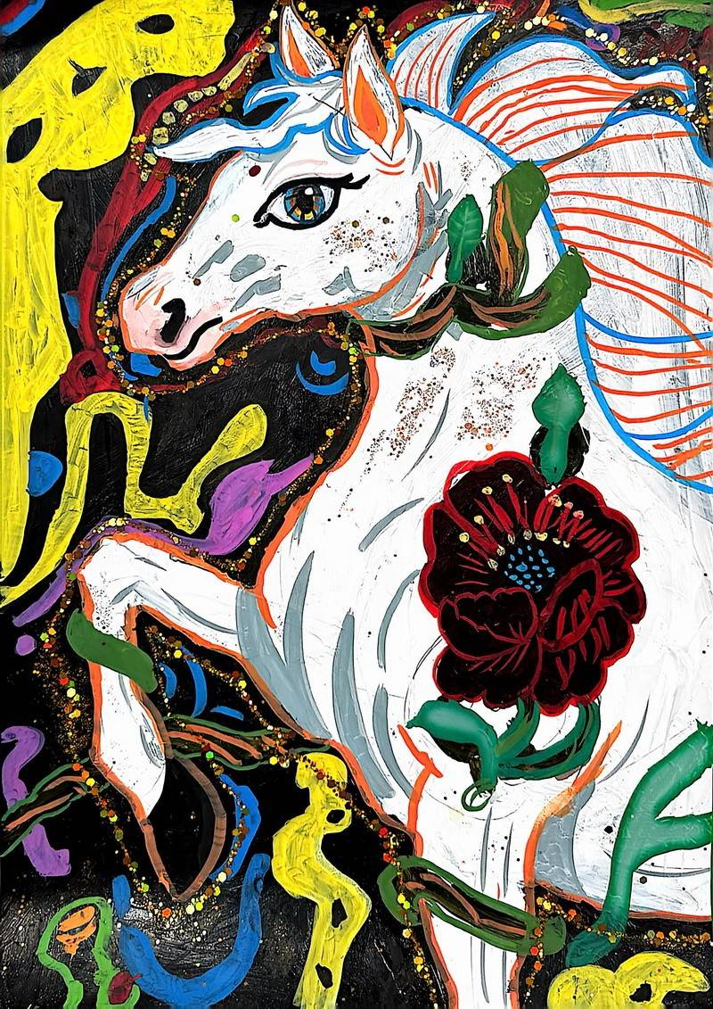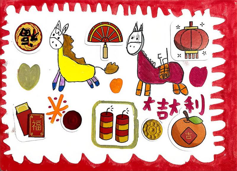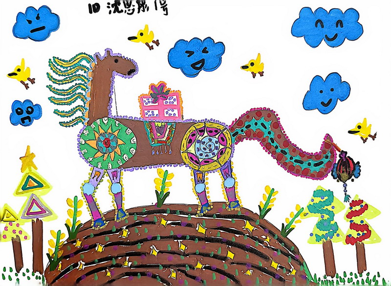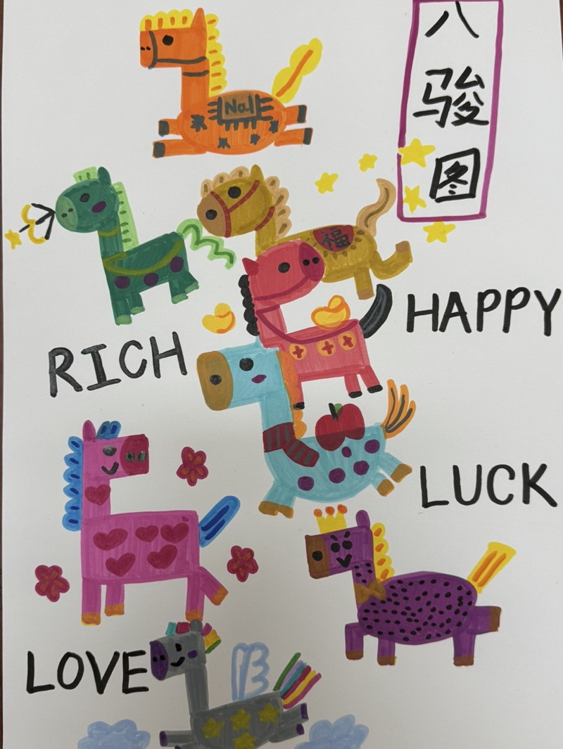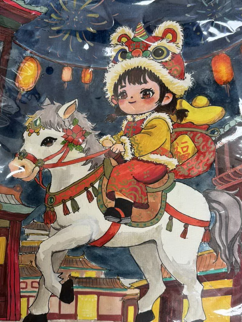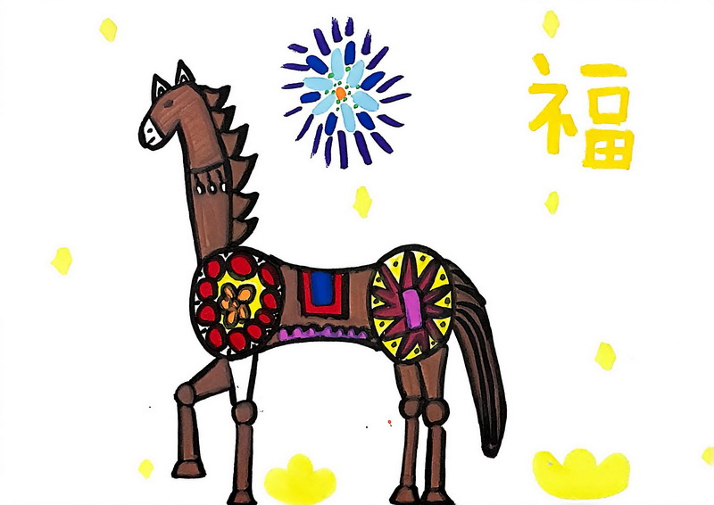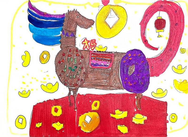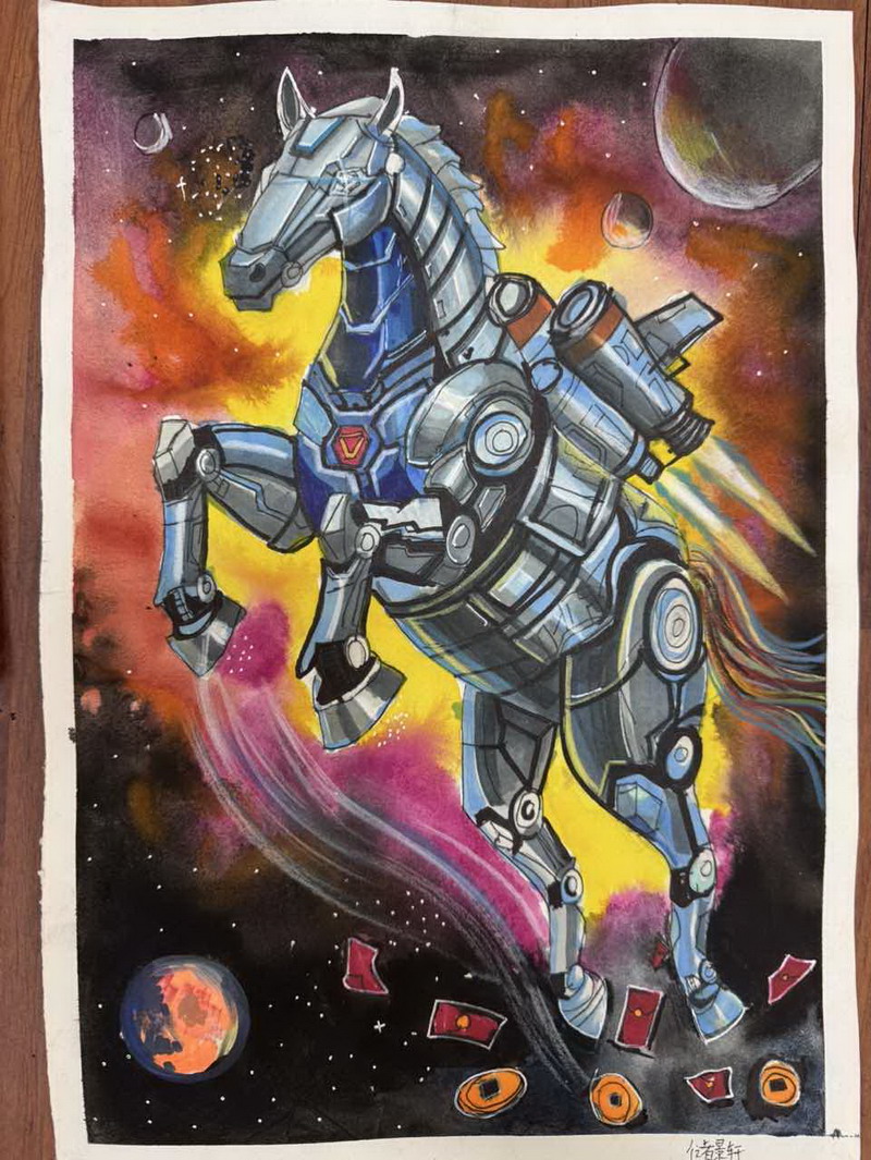 “马”本身就是吉祥的象征,而这一类作品把祝福写得更直观:同学在画面中加入新春祝福语,让马成为“祝福的载体”。这些作品不光一眼喜庆,细看更能感到孩子们对“新年”“吉祥”“愿望”的认真想象。