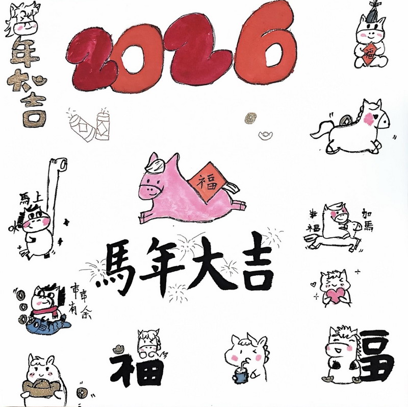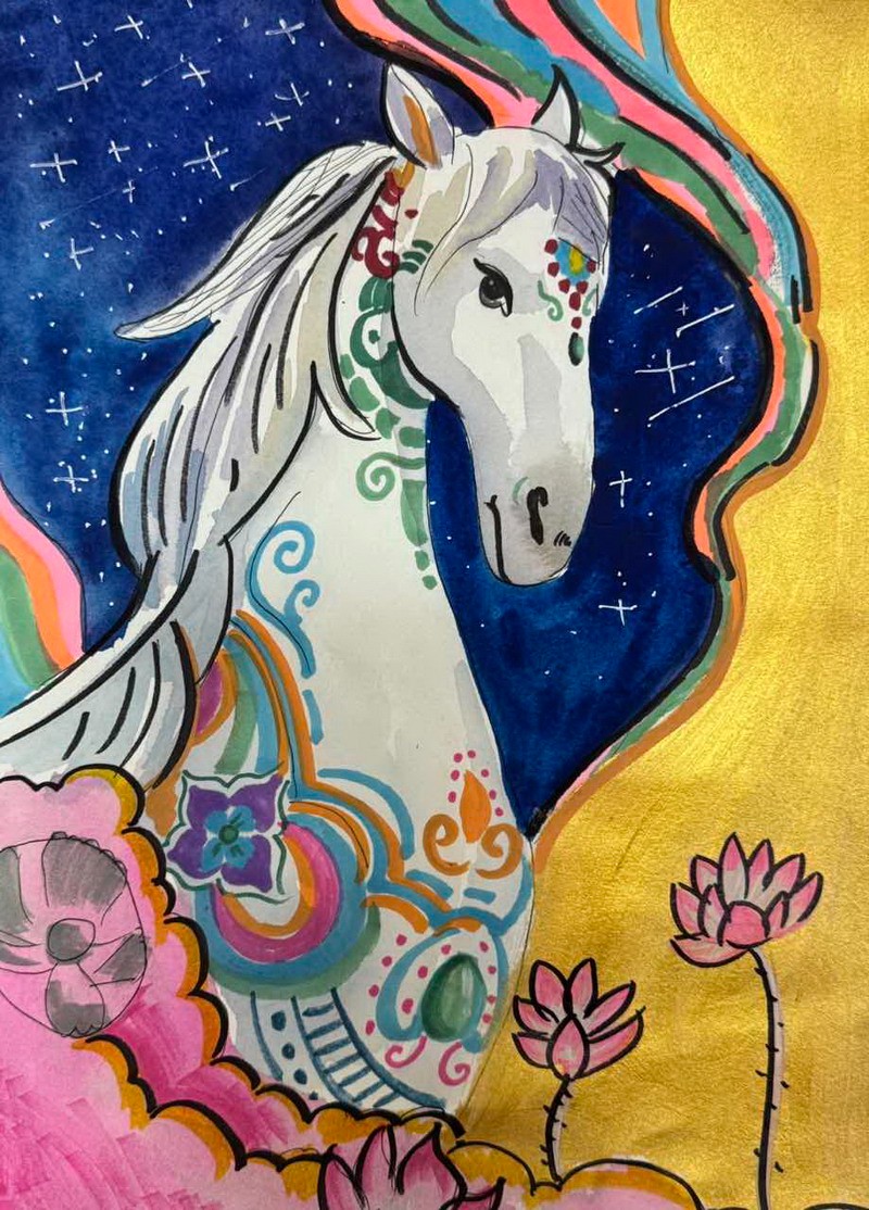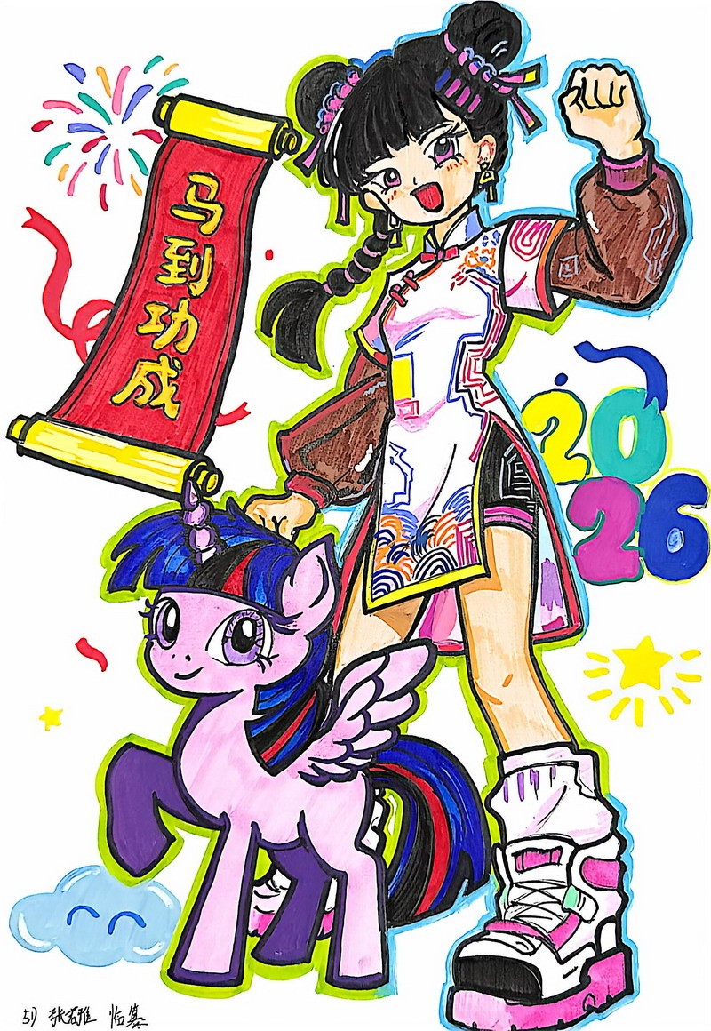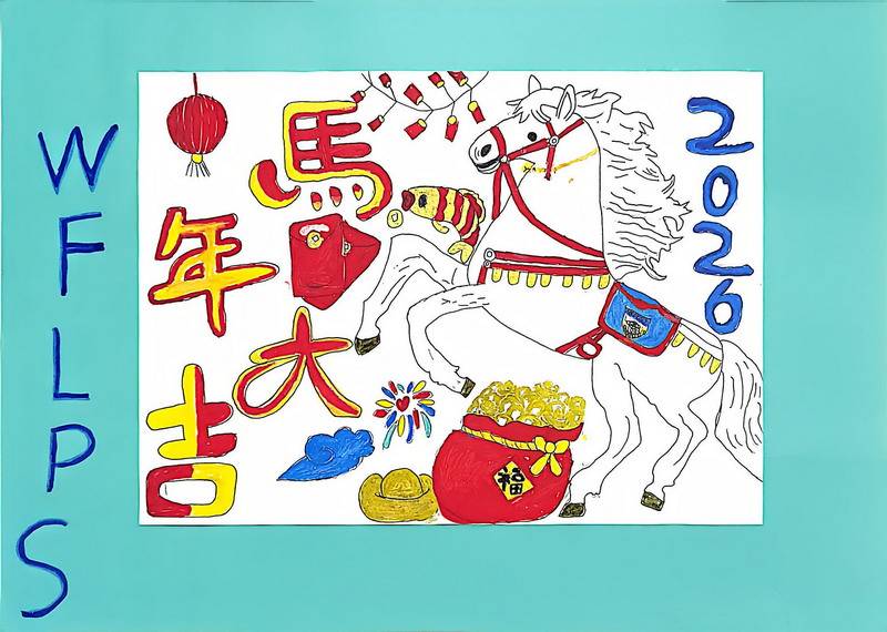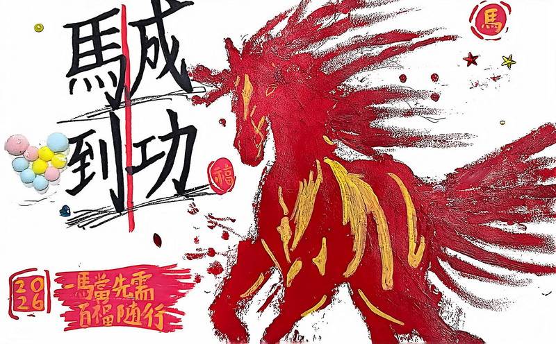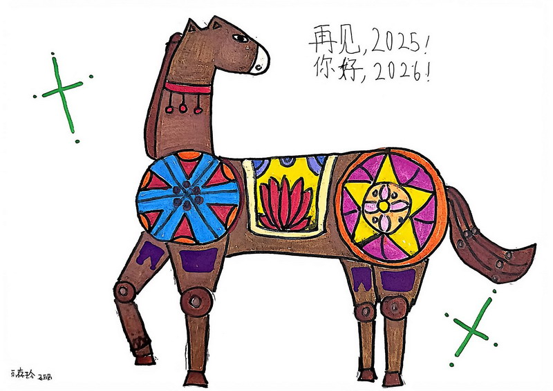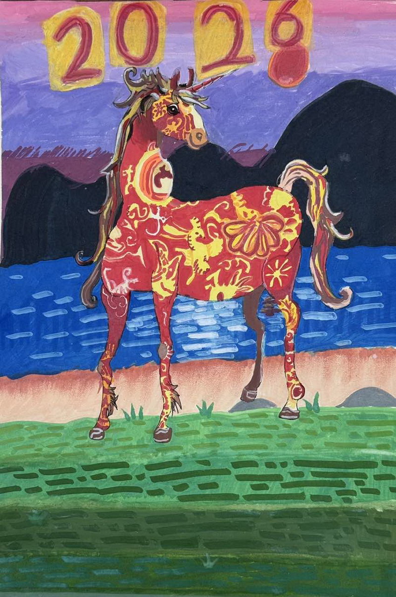“马”本身就是吉祥的象征,而这一类作品把祝福写得更直观:同学在画面中加入新春祝福语,让马成为“祝福的载体”。这些作品不光一眼喜庆,细看更能感到孩子们对“新年”“吉祥”“愿望”的认真想象。