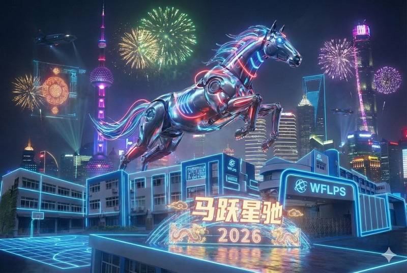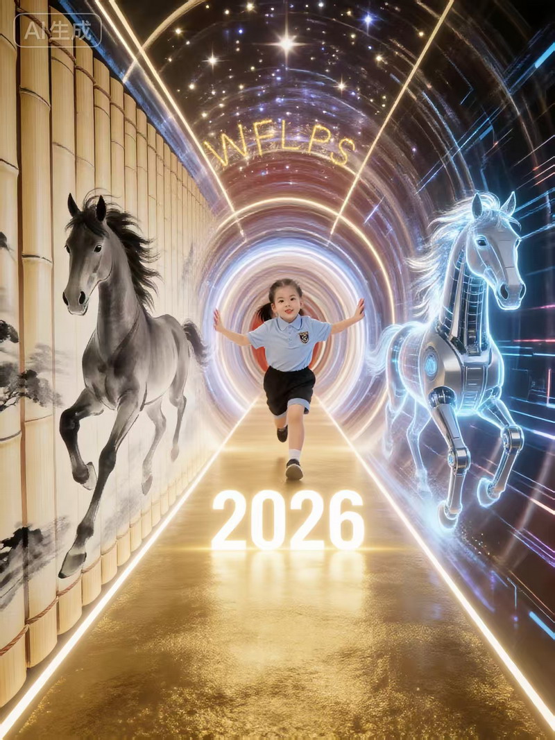 这类作品带着明显的“世外身份”。同学们把 WFL 字样写在马的身上,让马奔跑在熟悉的校园风景里;或让身穿世外校服的自己“穿越”进画里,与马一起成为故事主角。